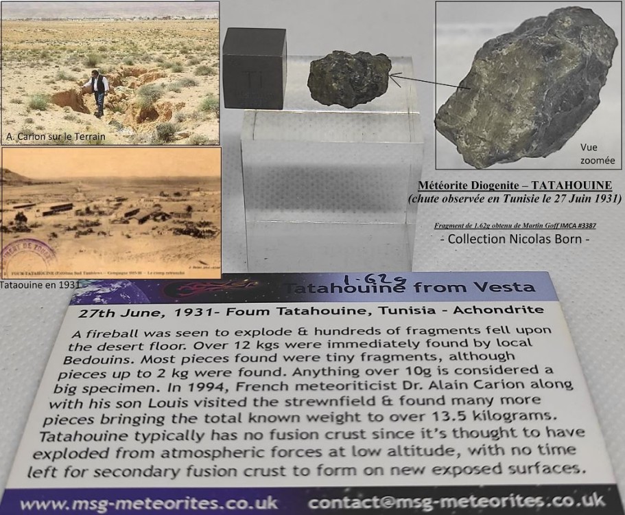 Météorite Diogenite – TATAHOUINE (chute observée le 27 Juin 1931) Tombée le 27 juin 1931 à 01h30, à 4 kilomètres au Nord-est du village de Foum Tataouine en Tunisie. L’explosion et la lueur intense réveilla toute la population et aussi la garnison française (rapport du capitaine Lewden). Ils émettront des témoignages d’une boule de feu traversant le ciel en direction Ouest-Est pendant près d’une trentaine de seconde, suivi de fracas comparables à des grenades. Le lendemain des légionnaires français et bédouins locaux retrouvaient près de 12kg de fragments qui furent recueillis et transmis au Muséum d’Histoire Naturelle de Paris. Découvert à l’intérieur de ‘’dépressions formées dans le sable sous forme d’entonnoir’’ (rapport du capitaine) et d’un point essentiellement inférieurs à 10g, quelques fragments dépasseront les 2kg. Ce n’est que plus tard en 1994, que l’expert scientifique en Météorite, Dr Alain Carion, retrouvera le site de chute et reprendra des prospections sur le site, entrainant de nouvelles découvertes. L’étude de ces nouveaux échantillons permit de constater une évolution chimique de la météorite et en particulier la présence de bactéries, alors que sur les échantillons de 1931 ces bactéries n’existaient pas. On prouva ainsi l’origine terrestre d’autres bactéries découvertes sur une météorite d’origine martienne, ALH84001, tombée depuis 13 000 ans en Antarctique. Remettant ainsi en cause cette pseudo théorie d’une vie bactérienne Martienne. Pour l’anecdote c’est de ce même village que dérive le nom de la planète de la célèbre saga Star Wars. Ce fragment de 1.62g est de teinte caractéristique verte à grisâtre, localement veinée de noir. C’est une météorite particulière, entièrement silicaté et dépourvue d’éléments métalliques/ferriques. Elle est formée de cristaux de Pyroxènes (Hypersthène) dont la grosseur du grain laisse présager une roche de nature originelle pegmatitique/grenue. Ayant subie de fortes contraintes mécaniques pression/température elle présente une structure cataclistique apparente à un verre. Elle appartient au groupe des achondrites HED (Howardites, Eucrites, Diogénites) et proviendrait de l’astéroïde Vesta. Le spectre de réflexion de ces météorites est très voisin de celui de Vesta. Ce corps parent ayant subi un impact violent qui a créé l'énorme cratère Rheasilvia et éjecté des astéroïdes ayant eux aussi un spectre de réflexion très semblable, la probabilité pour que des fragments extraits des vestoïdes (par d'autres impacts) arrivent sur Terre est relativement élevée. Les Diogénites sont composées de roches magmatiques d’origine plutonique qui se sont solidifiées assez lentement à intérieur de la croûte de Vesta. Les spécimens types d’études sont conservés au « Museum d’Histoire Naturelle de Paris». Elle sera étudiée et publiée par le célèbre Géologue Alfred Lacroix dans le bulletin de la Société Française de Minéralogie Vol 55 en 1932. Ce fragment de 1.62g obtenue & certifiée par Martin Goff – Membre IMCA #3387 Origine : Tatahouine, Tunisie Collection Nicolas Born -