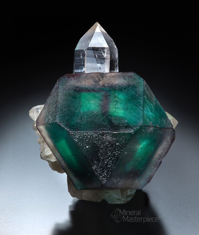 3. Hello bien sur, on peut donner en exemple les célèbres pyrites en dodécaèdre pentagonal de Huanzala Pérou. Concernant les petites fluos de Namibie il me semble voir 6 arrêtes sur le cristal haut gauche (la partie éclairée), si tu peux refaire une photo en gros plan ... En tout cas, bien sympa ces petites fluos de Namibie, le petit cristal bas droite présente de très belles zonations, dans la veine des célèbres "Alien eye". Hello pour rester sur les fluos de Namibie, une fluorite Alien Eye associé à un quartz (photo de Mineral Masterpiece)