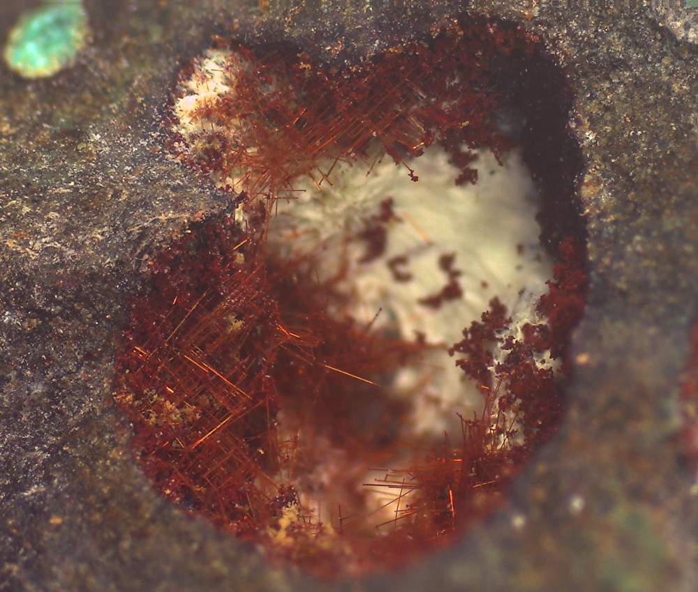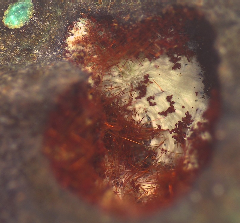 Bonsoir, Vacuole du soir... Inhabituelle: un fond blanc (silice ?), des aiguilles orangées et non rouges, des agrégats rougeâtres faisant penser à du cuivre natif oxydé 5,4 x 4,1 mm Les agrégats du fond plus nets... -