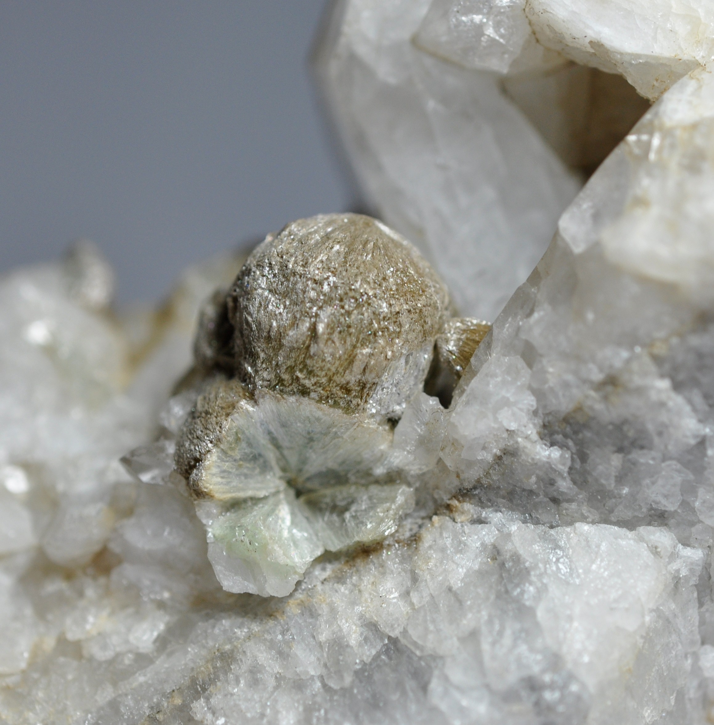 Bonjour. Voici un étrange minéral en boules sub-centimétiques gris verdâtre. La structure interne semble lamellaire. Le minéral est tendre et fragile. Il est accompagné de Quartz et de Calcite. Il a été trouvé dans la haute vallée d'Ustou, en Ariège. Poids du caillou 315 g pour 10,5 cm. Quelqu'un a-t-il une idée?