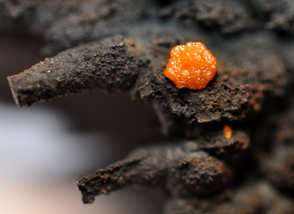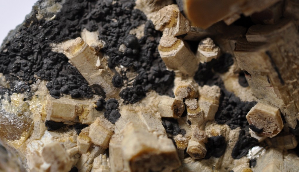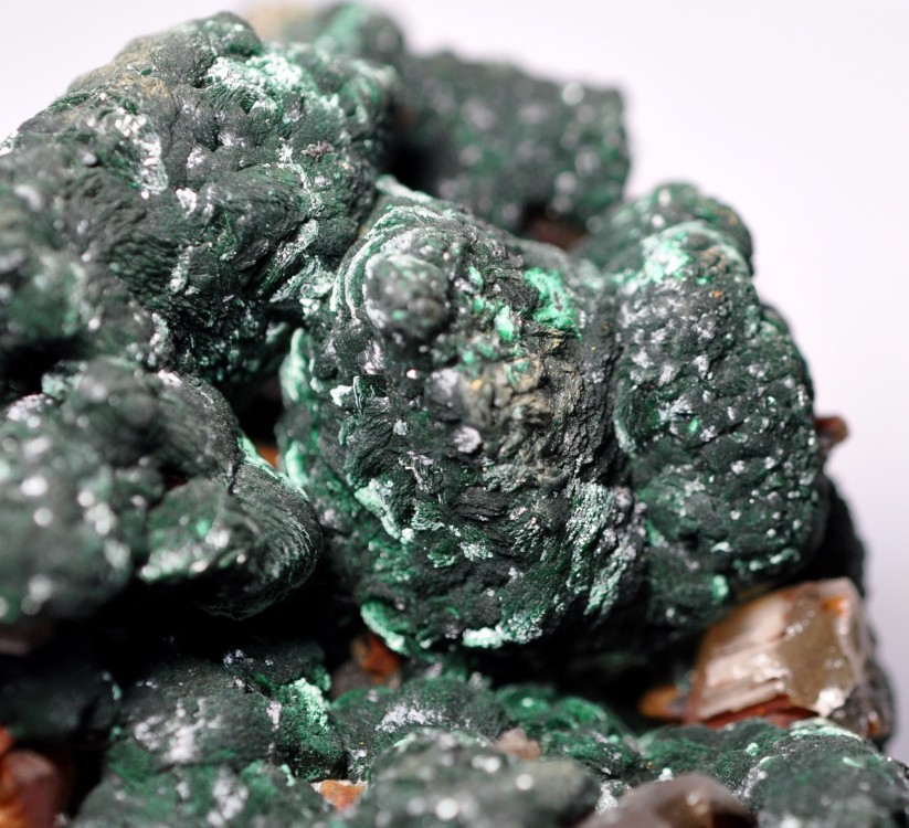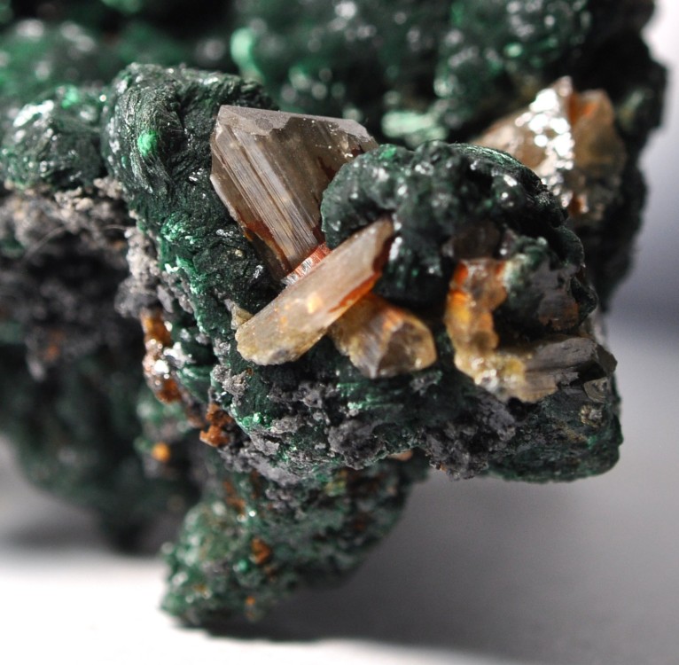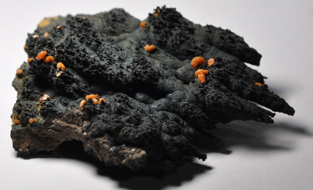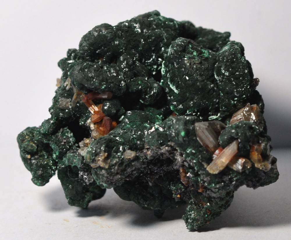 Bonjour à tous. Voici une Vanadinite arsénifère (Endlichite) de Touissit datant des années 70. Taille 10 cm. Elle est accompagnée de Dolomite microcristallisée et d'un minéral noir à vert foncé (le même?) dont je vous soumets quelques photos à la bino. Mottramite? Oxydes de manganèse? Merci d'avance!