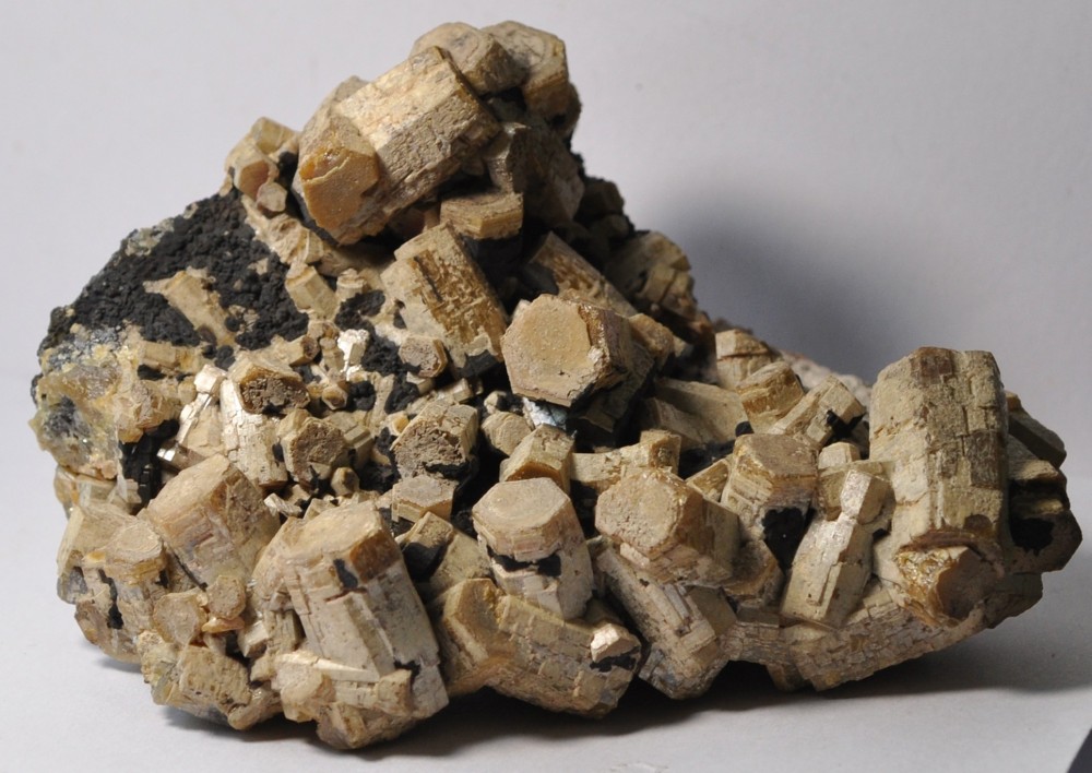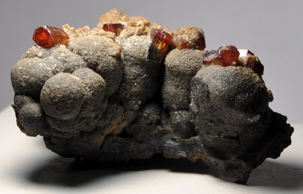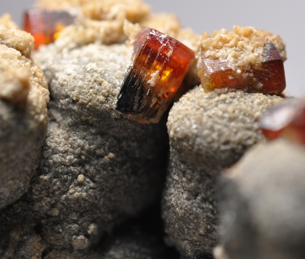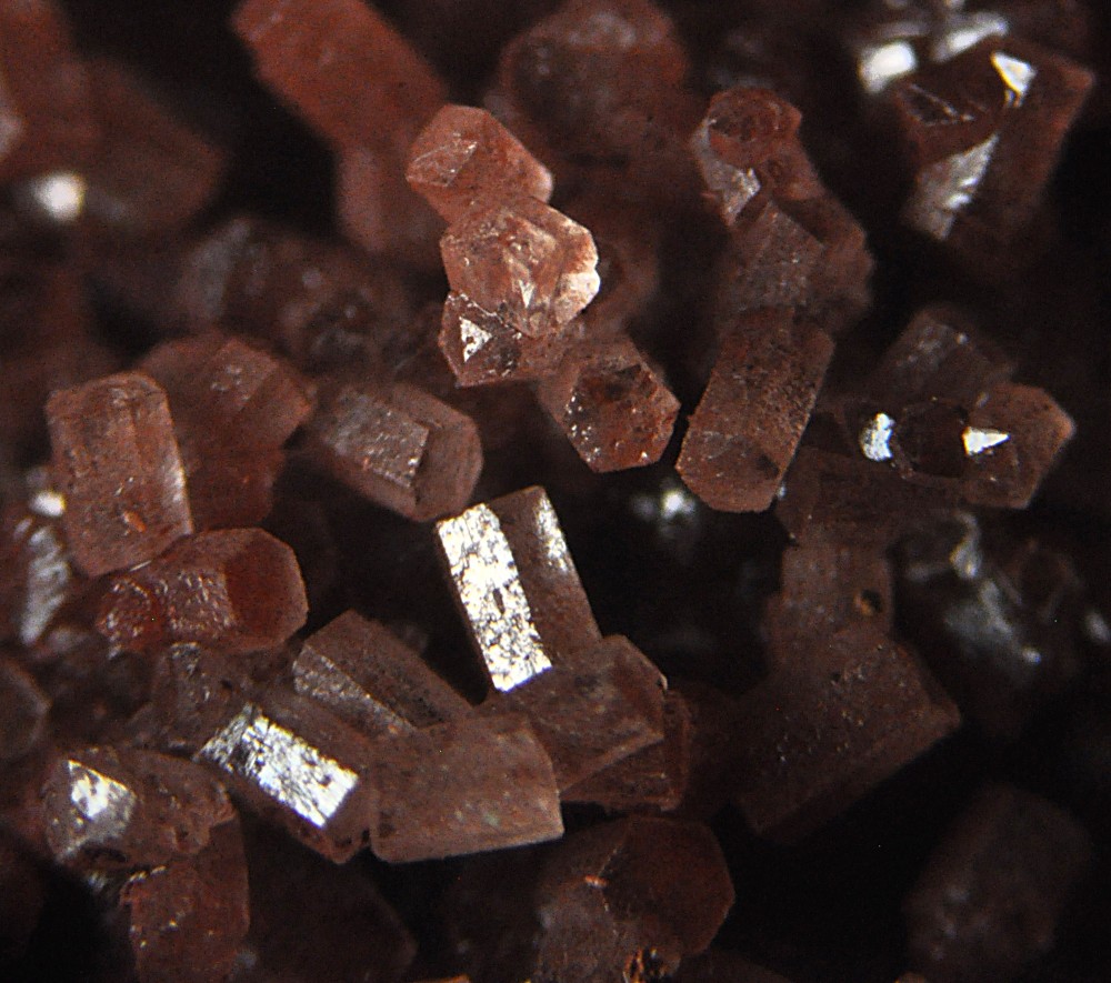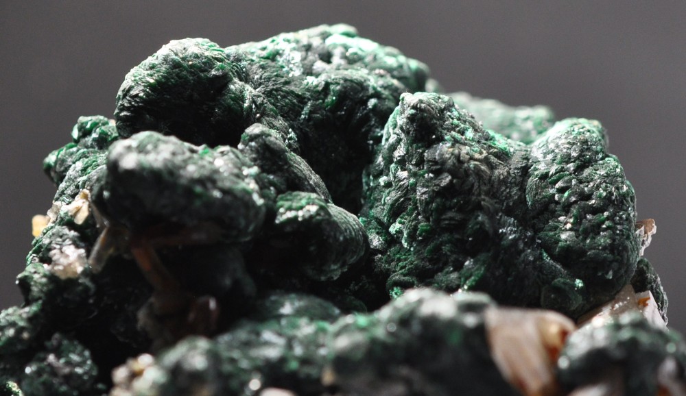 Bonjour à tous. Voici une Vanadinite arsénifère (Endlichite) de Touissit datant des années 70. Taille 10 cm. Elle est accompagnée de Dolomite microcristallisée et d'un minéral noir à vert foncé (le même?) dont je vous soumets quelques photos à la bino. Mottramite? Oxydes de manganèse? Merci d'avance!