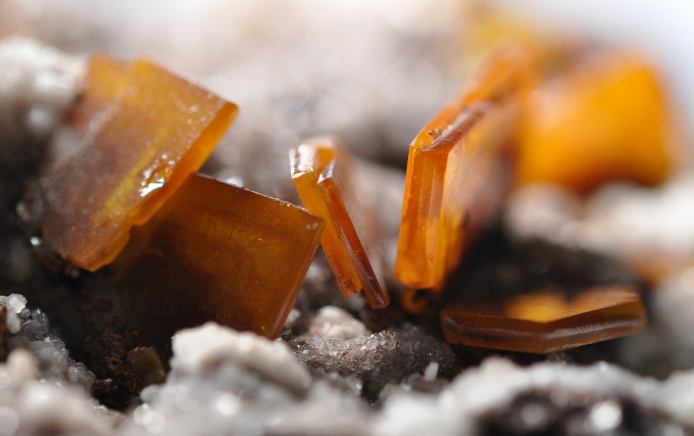 Bonjour à tous. Voici une "Wulfénite du Mexique" achetée dans les années 90 à la boutique du Muséum à Paris. Taille 10x9,5 cm. Je suppose au faciès de la Wulfénite qu'elle provient peut-être de Los Lamentos. Le caillou comprend aussi de la Calcite millimétrique lenticulaire et rhomboédrique. Mais sa face arrière est couverte de microcristaux prismatiques hexagonaux incolores à brunâtres. La vanadinite est signalée à Los Lamentos... mais peut-elle être incolore et transparente? Merci d'avance! -