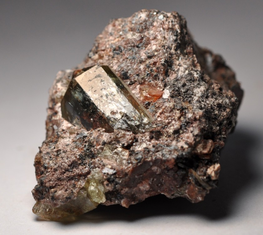 Bonjour à tous! Toujours en révision de ma collection, je vous présente une Apatite prismatique de 1,6 cm à terminaison pyramidale. Elle est transparente dans les tons vert olive à bleu vert. Elle est incluse dans une roche granuleuse assez dense. L'étiquette indique "Portugal" avec un point d'interrogation. Quelqu'un a-t-il déjà vu cela? Merci d'avance. -