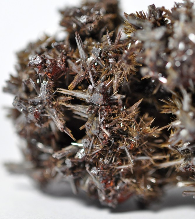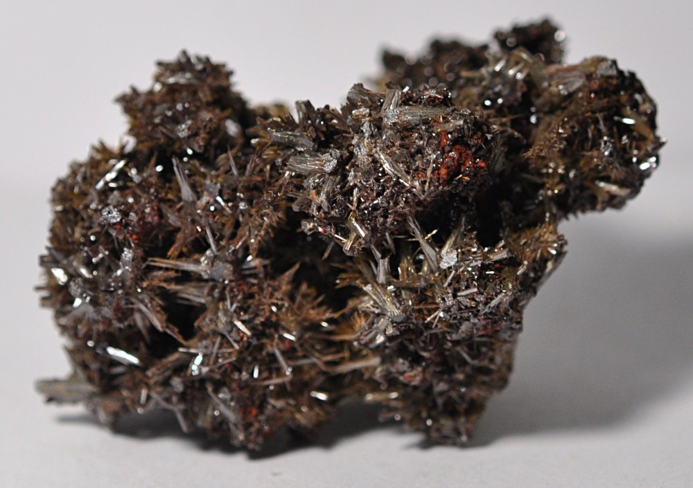 Bonjour à tous. Encore une vielle pierre de ma collection, achetée en boutique au début des années 80. L'étiquette indique Pyromorphite - Névada. Et je n'y croît pas beaucoup, ni pour l'espèce, ni pour la provenance. J'ai bien une petite idée, mais j'aimerais avoir vos avis sans les influencer. Elle mesure 5,2 cm et pèse près de 60 grammes. Il semble y avoir 2 espèces : des cristaux aciculaires brun gris à fort éclat (nacré/métallique); des microcristaux brun foncé translucides en tablettes. Merci d'avance.