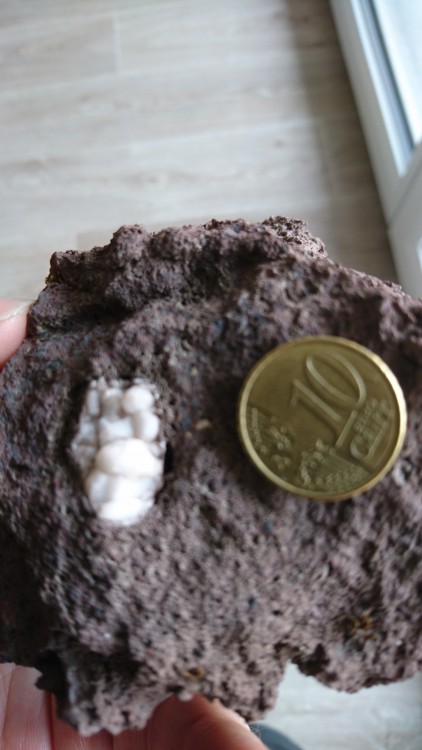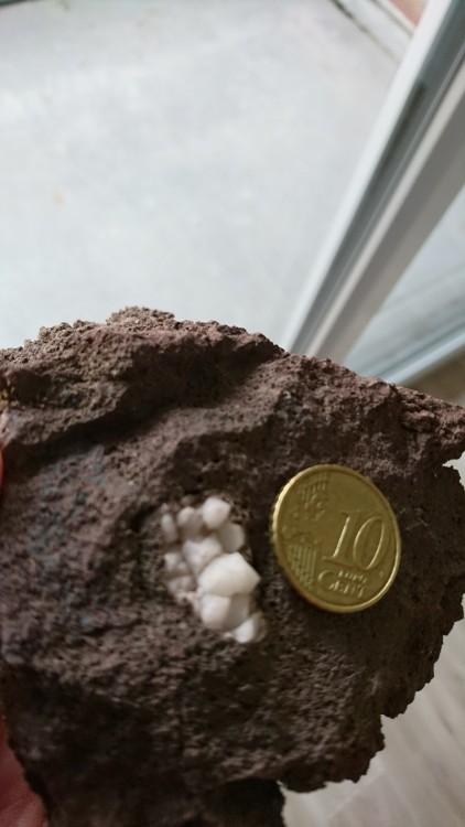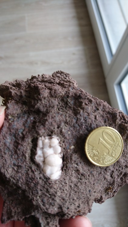 Bonjour à toutes et à tous je vous préviens : je pars de zéro je suis de l'extrême nord de la France et je m'aventure pour la première fois sur des terrains volcaniques : en haute loire, plus précisément, je suis sur le plateau du Deves ce que j'étais venu chercher : quelques traces d'olivine dans du basalte. je ne pensais pas que l'on pouvais trouver autant de basalte sans la moindre trace d'olivine, lol première sortie aujourd'hui : sur le "mont" en dessous de celui de la Durande (voir carte) je suis tombé sur une carrière de roche rouge plaine de trous et légère que je n'avais jusqu'ici vu que dans les aquarium (la carrière est visible sur google earth) au sein d'un morceau de cette roche dont je suis venu vous demander le nom, j'ai trouvé une cristallisation d'un minéral dont je suis également venu vous demander ce que cela pourrait être (une zéolithe ???) voir photos, merci d'avance