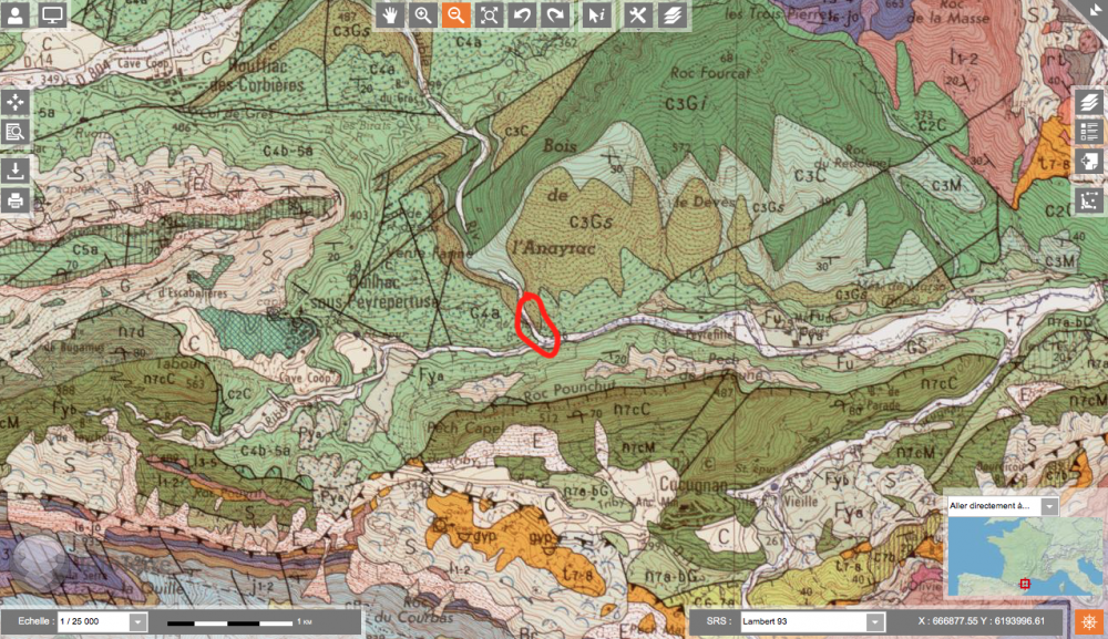 D'accord merci beaucoup! Donc silex, mais en rien un fossile. Et le reste vient des gorges du Verdouble a Duilhac-sous-Peyrepertuse. Cette carte géologique, elle se trouve sur ce forum? On peut rajouter ce qu'on veut...? Merci a vous! -