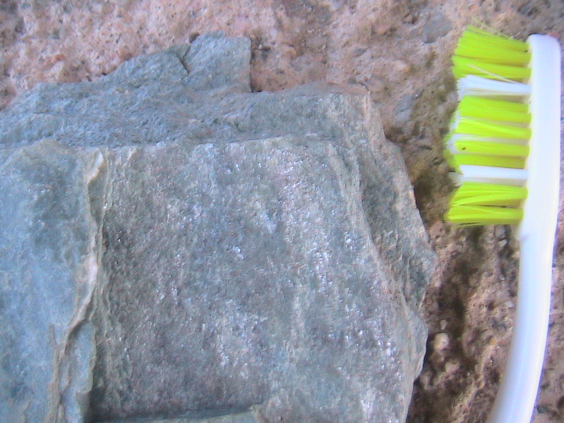 22. trace blanche sur morceau de carrelage niveau dureté : la pointe du couteau laisse une marque métallique sur la roche verte qui est beaucoup plus dure que le granite qui l'entoure.