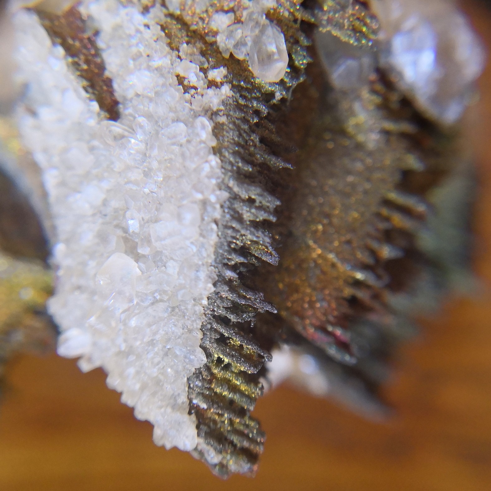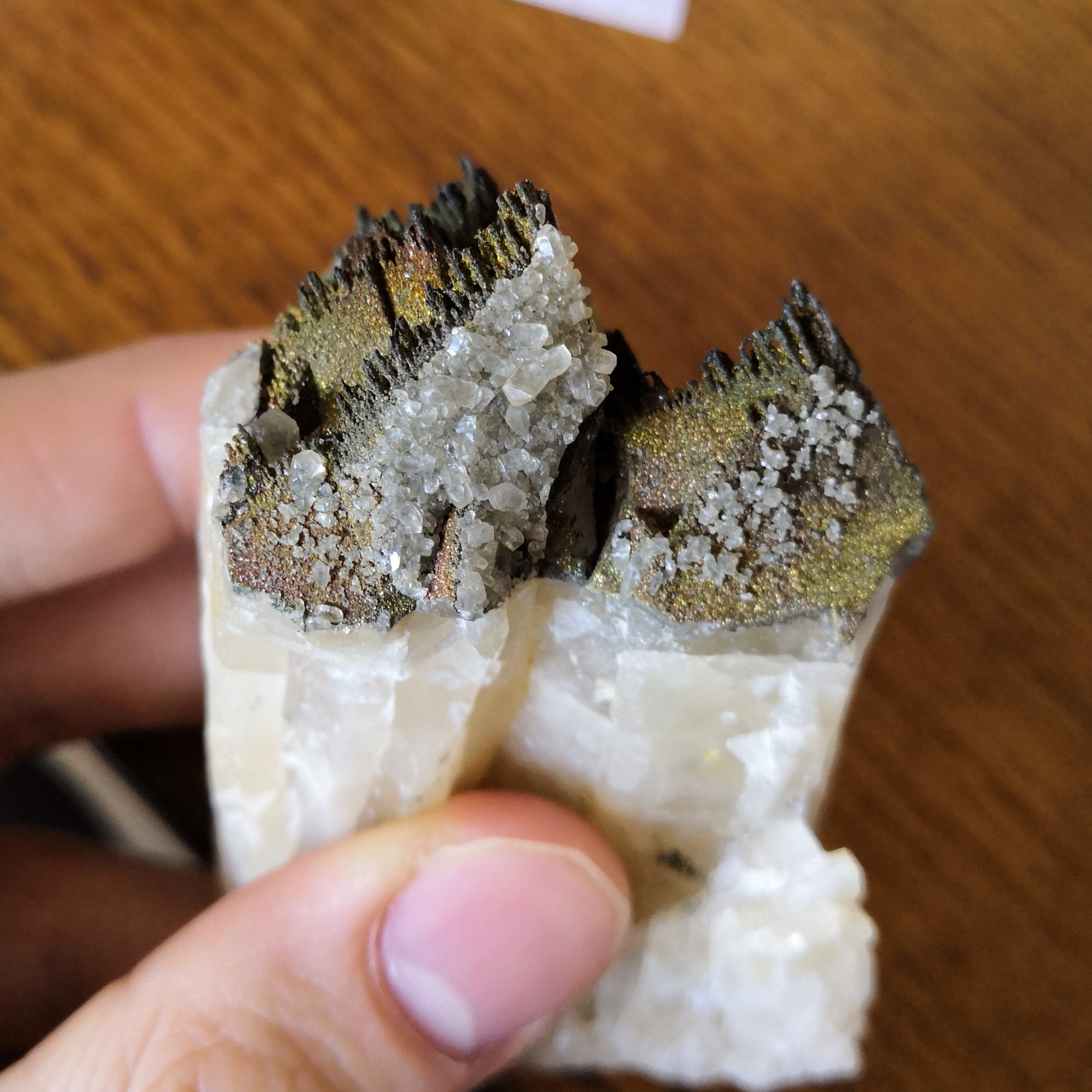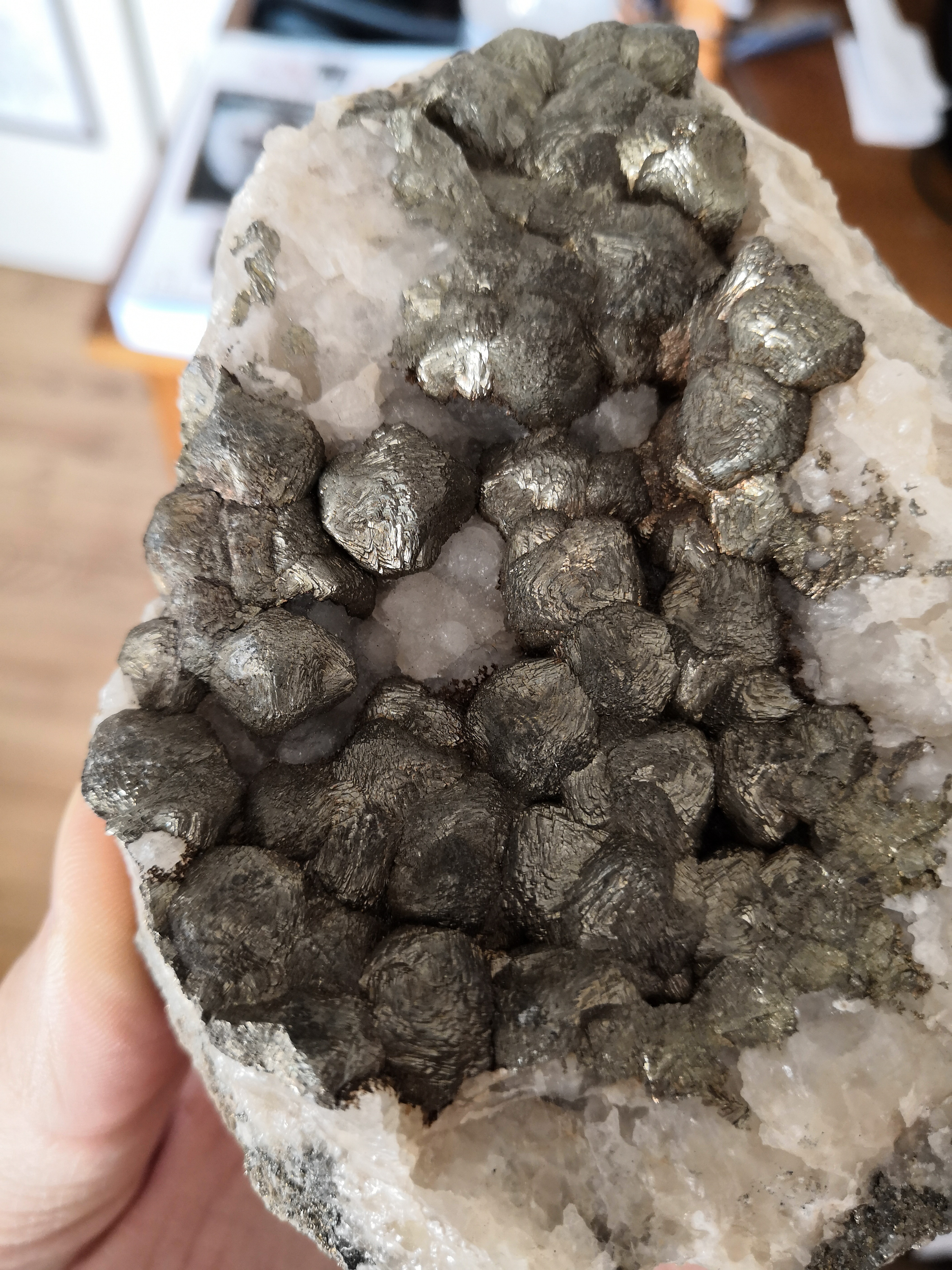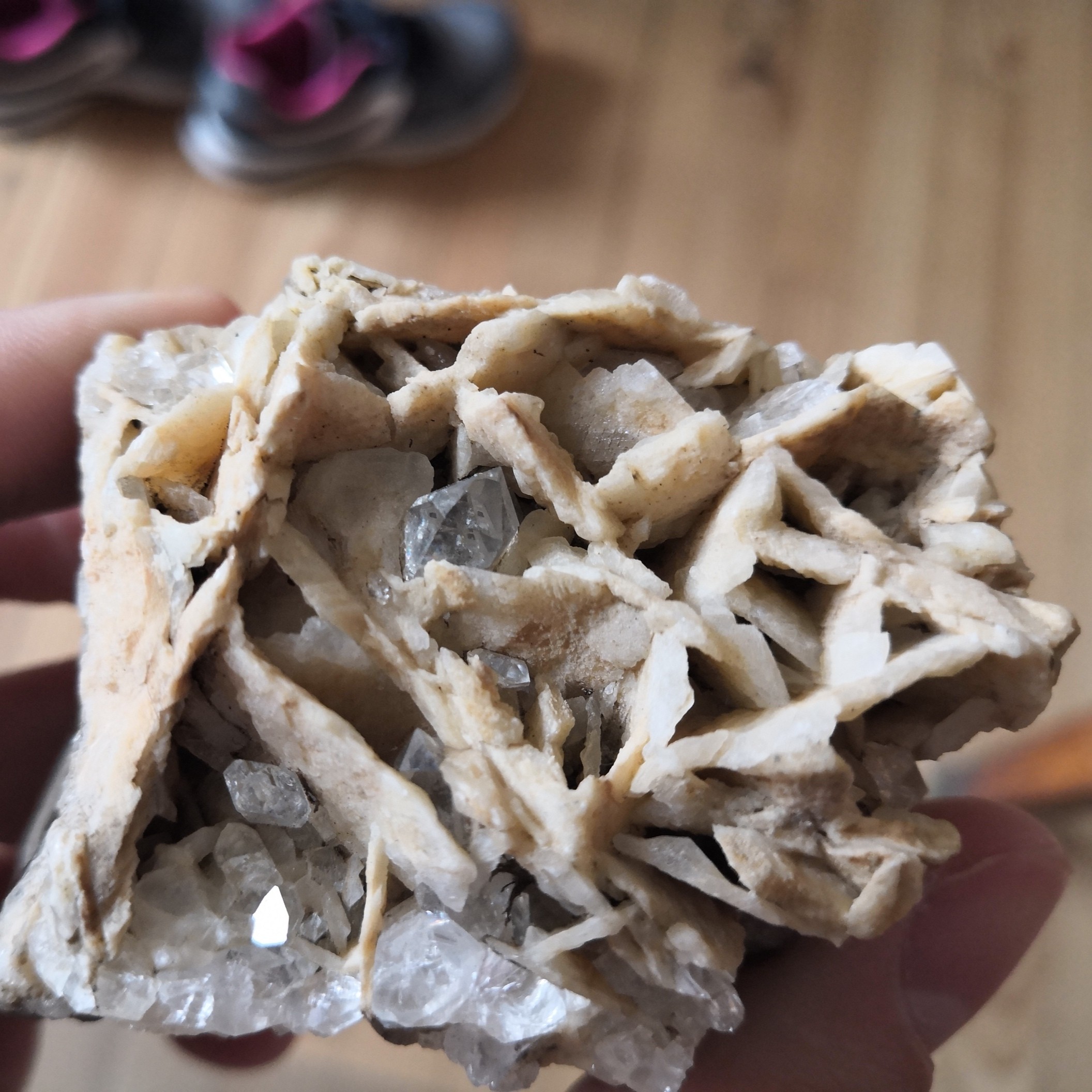 Je continue donc, avec ceci : VID_20200503_152845.mp4 Cristaux de quartz hyalin disposés au sein d'un enchevêtrement de cristaux lamellaires. J'ai d'abord pensé à de la Barytine, mais le test à l'acide est positif ce qui semble plutôt indiquer de la calcite (dureté 3 également). Aucune idée de la provenance, que ce soit français ou non. Des idées ? -