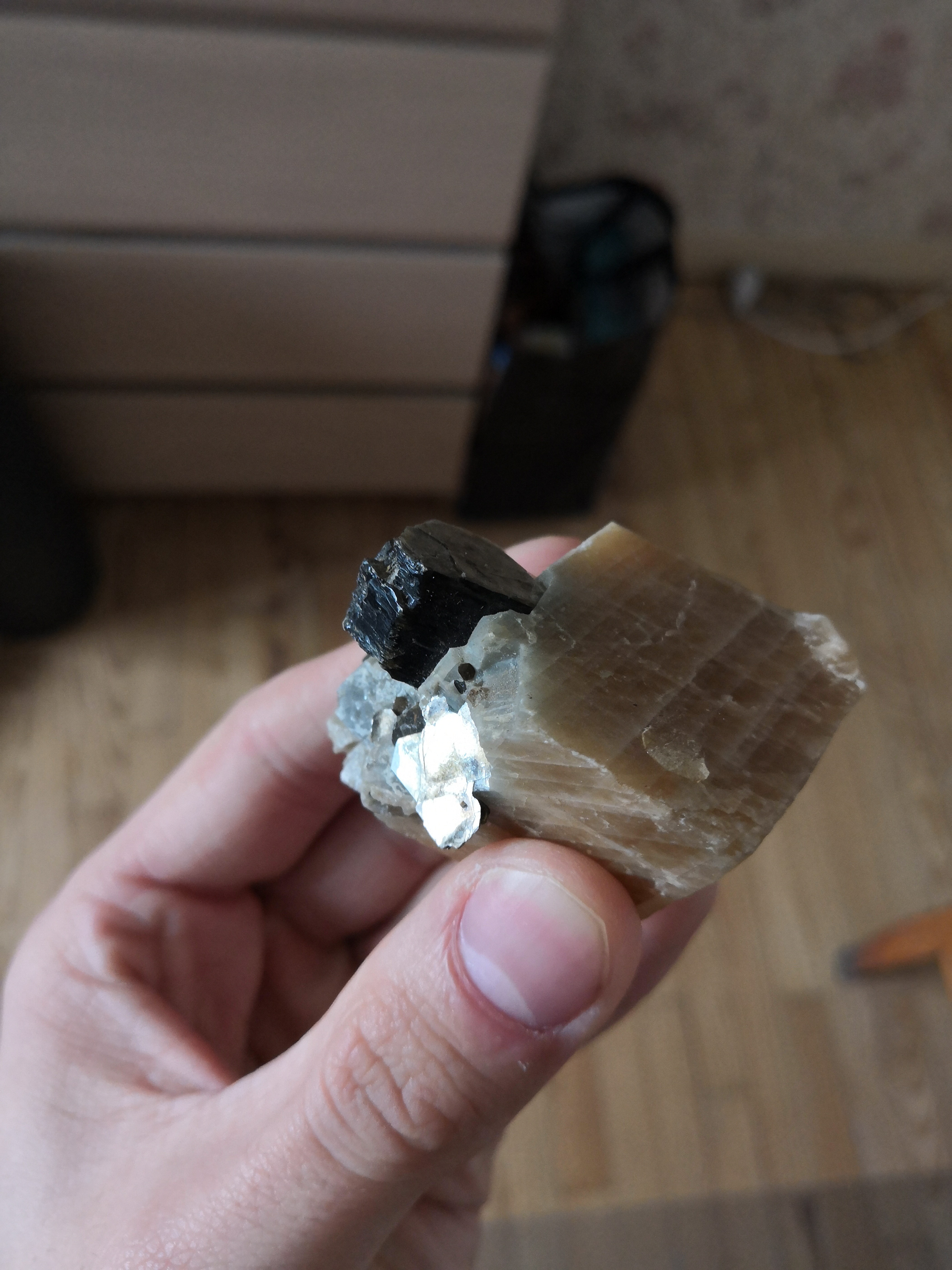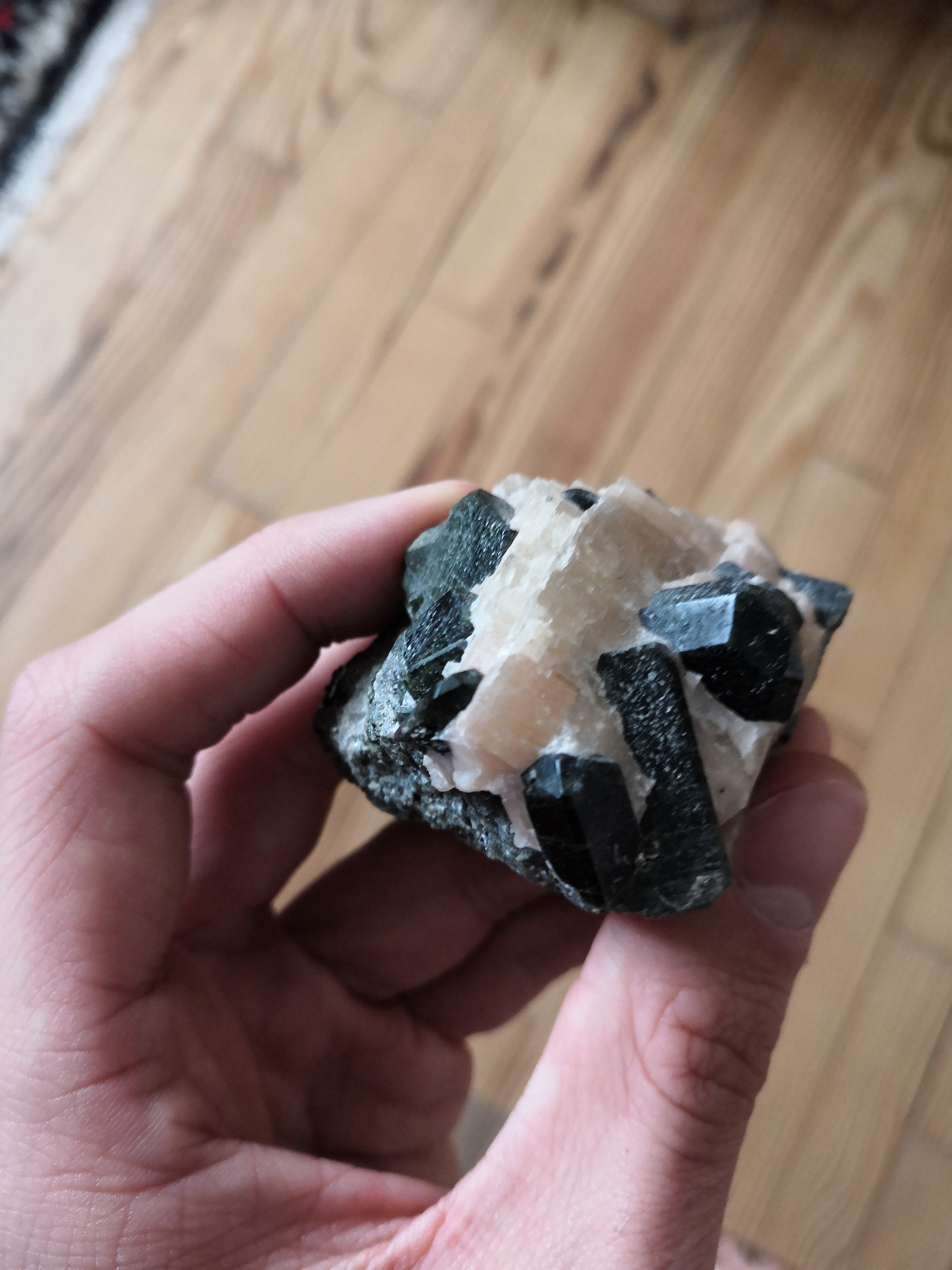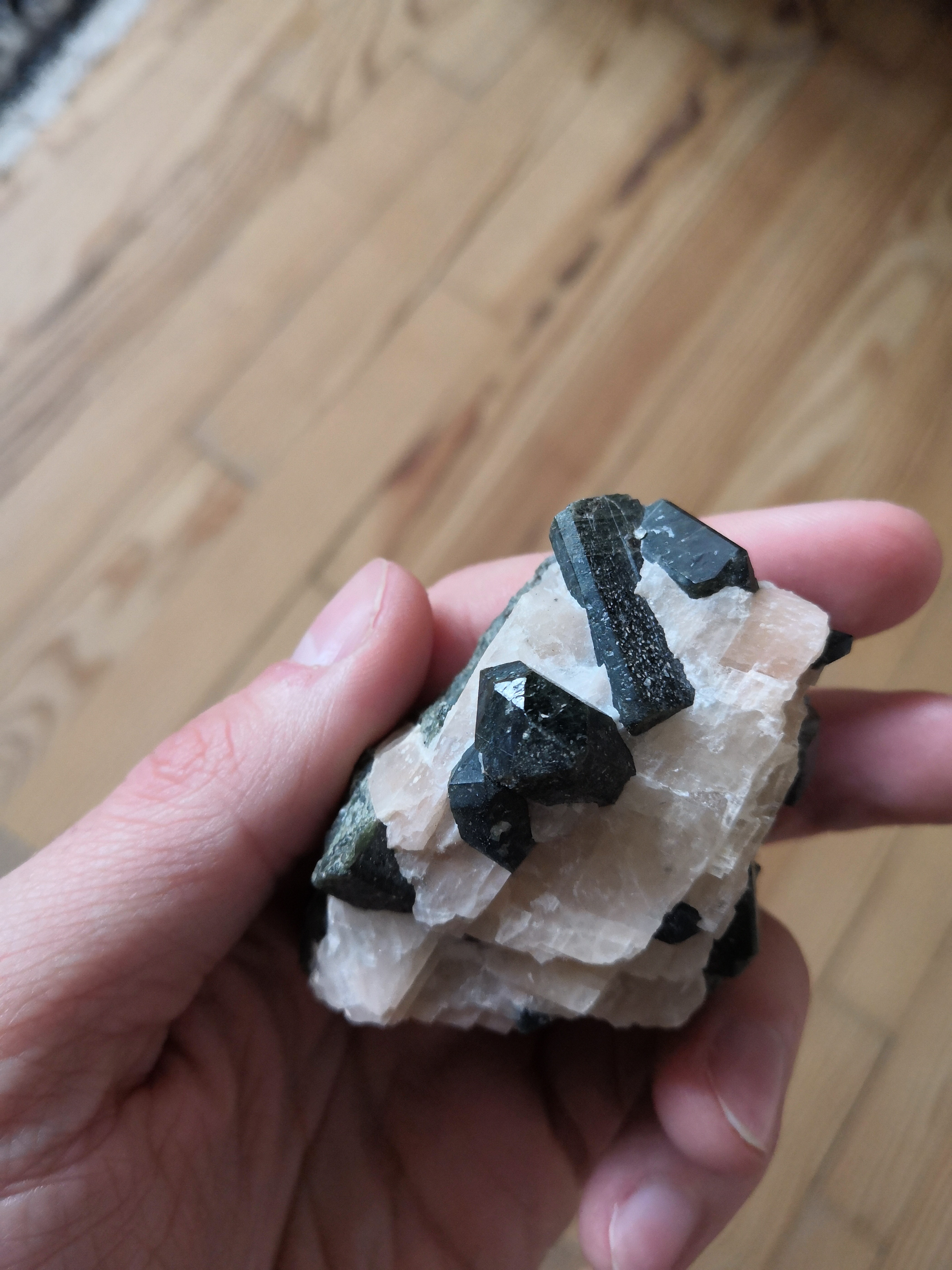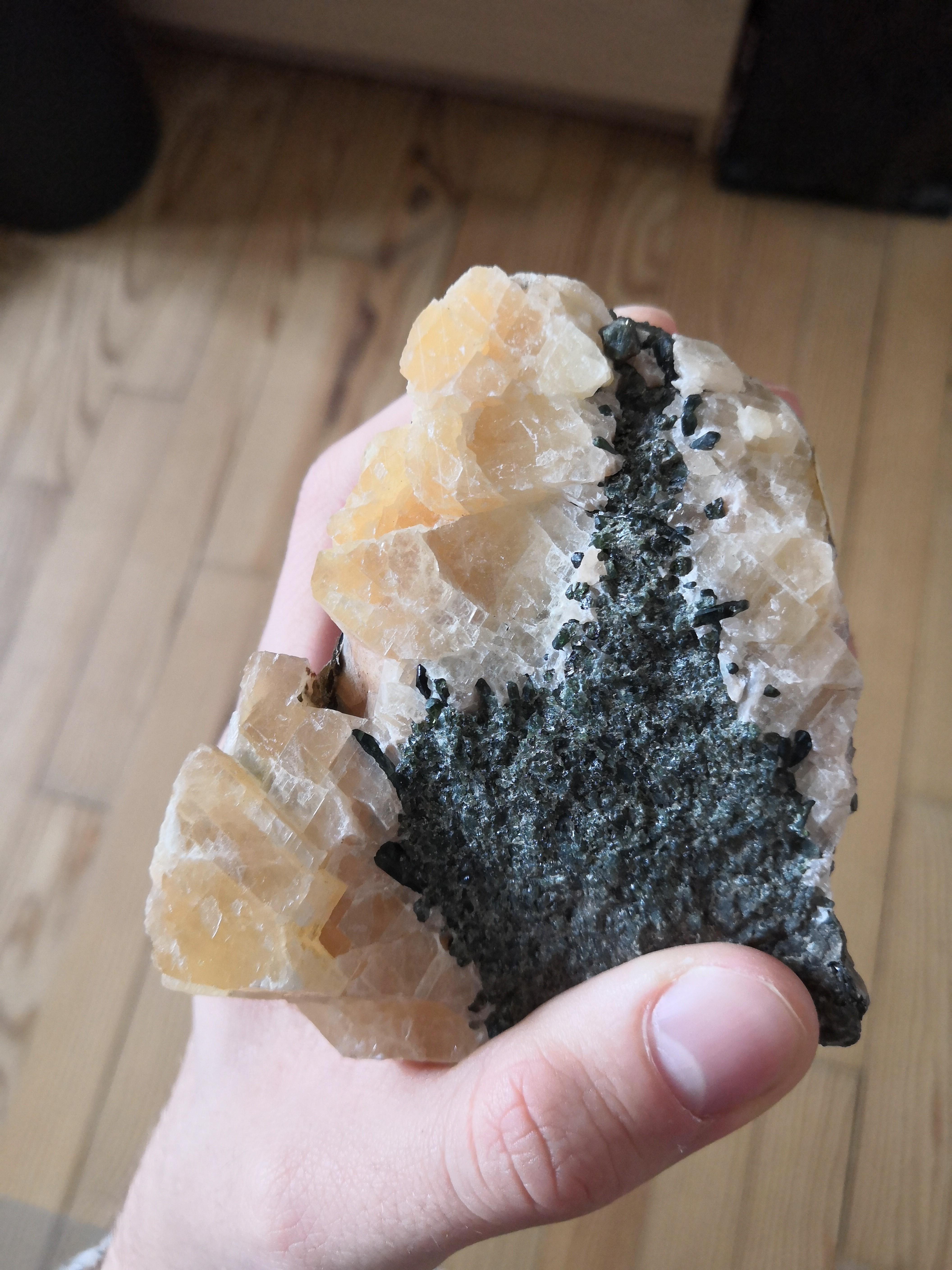 Tant que j'y suis j'en ajoute une, ou plutôt 3, puisque je suis persuadé qu'elles viennent du même endroit. Il s'agit d'une association de calcite orangée, d'un mica (biotite ?) et de cristaux de diopside (à mon avis) (Il s'agit de pièces d'une ancienne collection cette fois encore, achetées par leur ancien propriétaire comme l'indique un prix qui reste sur une etiquette pour la troisième) Voici la plus grosse: On a de grandes lames de mica sur cette face, sur des plans de clivage de la calcite. Sur la tranche on peut voir de nombreux cristaux de diopside Sur celle ci on a de beaux cristaux de diopside, plus gros, au sein de la calcite (plus vert très sombre que noir en vérité) Et sur cette troisième, on a à nouveau du mica sur la calcite. -