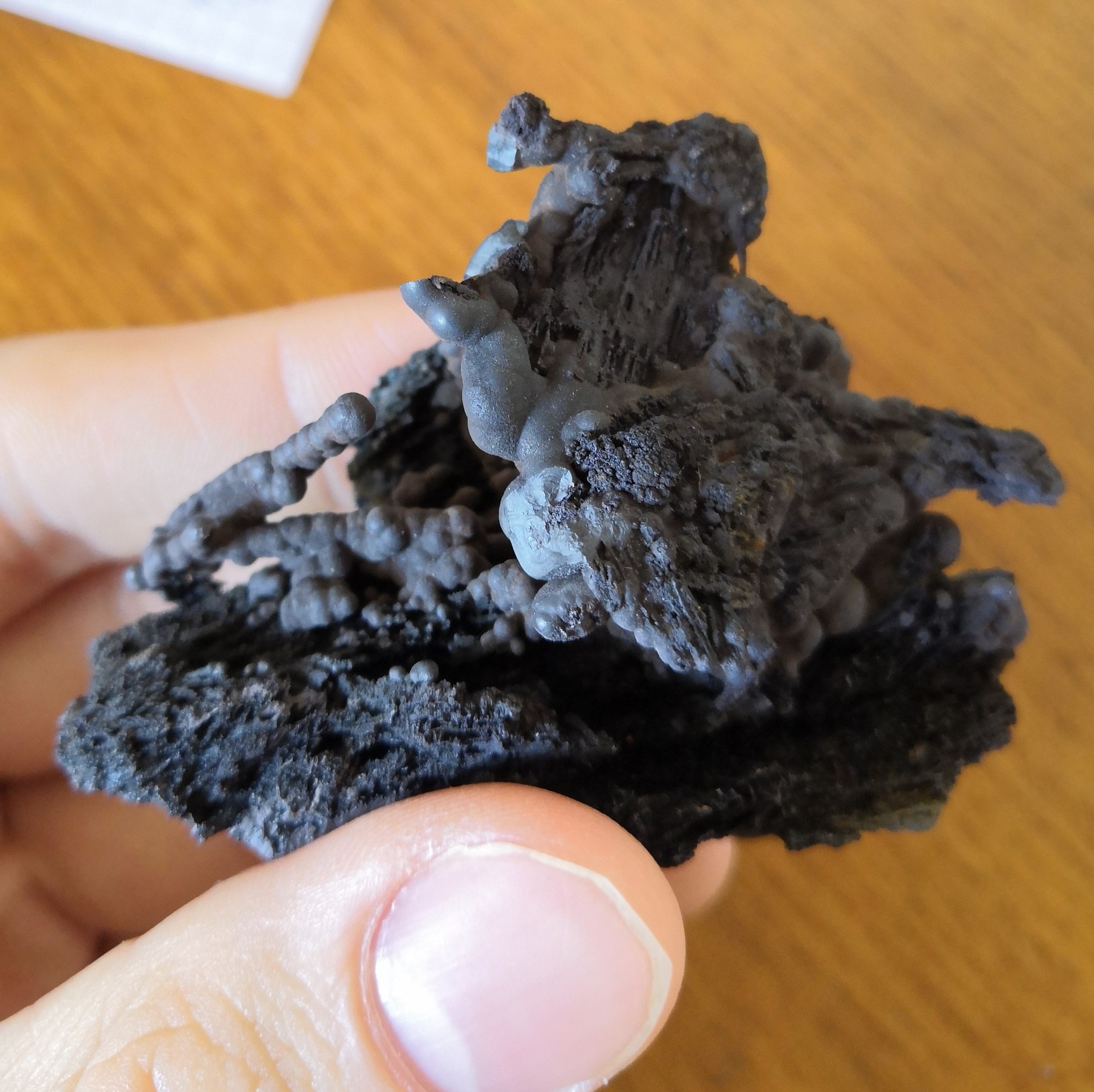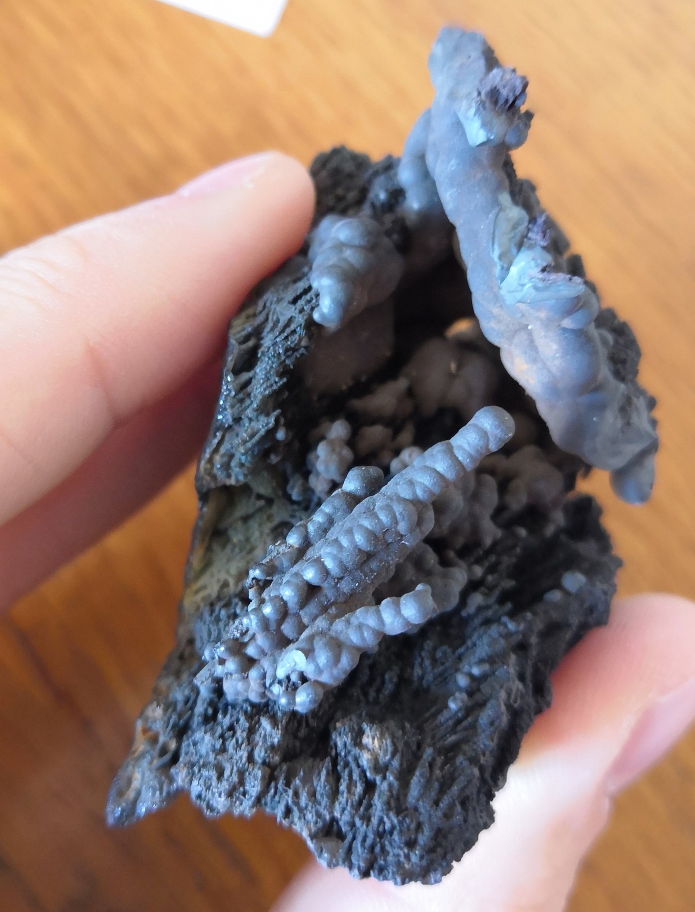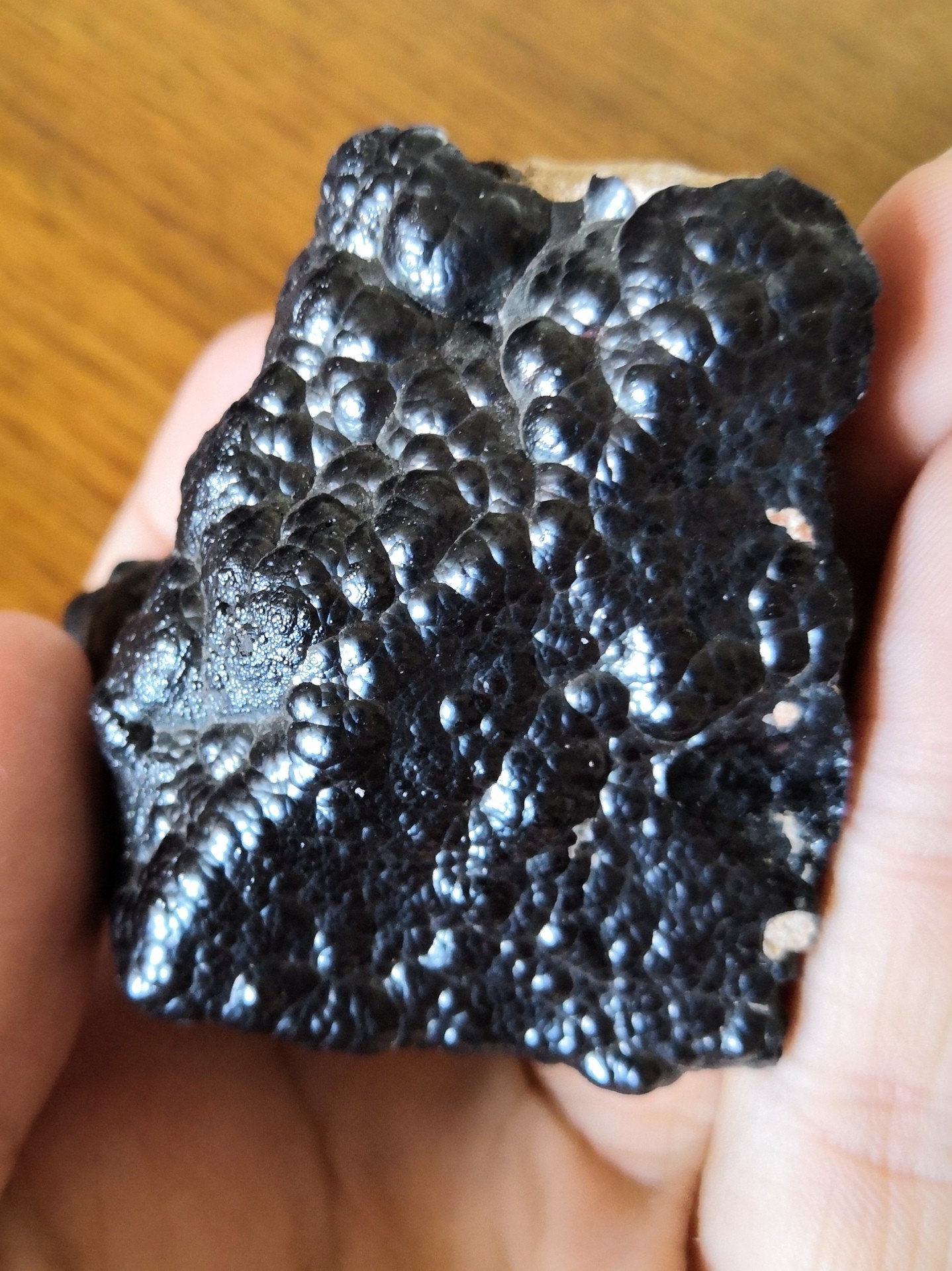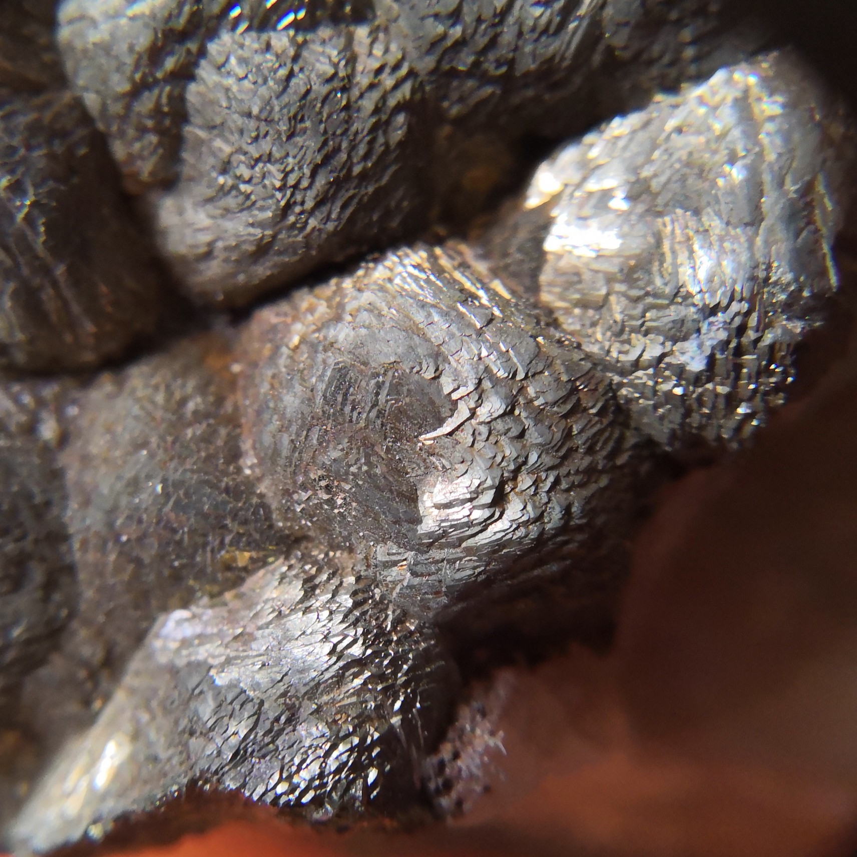 Je me permet d'en rajouter 3 autres. Elles etaient accompagnées de ces étiquettes : Voici la première, que je suppose être la pièce anglaise, mais qui me semble plutôt être une hématite botryoïdale (une qu'on peut trouver dans le Cumberland), non seulement par son aspect mais aussi parce qu'elle raye le verre (donc dureté supérieure à une goethite. Néanmoins j'aimerais bien avoir votre avis. Voici les deux pièces suivantes, qui me semblent effectivement être des goethites. La première : (dureté environ 5 cette fois) Et la dernière, assez particulière car irisée, accompagnée de calcite, et formant de fines concretions (pas de test de dureté cette fois). Photos difficiles à prendre avec mon équipement rudimentaire. (L'irisation est peut etre due à la goethite elle même ou à un voile de cristaux de pyrite, mais sans ma binoculaire, impossible de distinguer des cristaux cubiques ou autre, en tout cas rien de visible à la loupe x10) Merci d'avance pour vos suggestions ! -