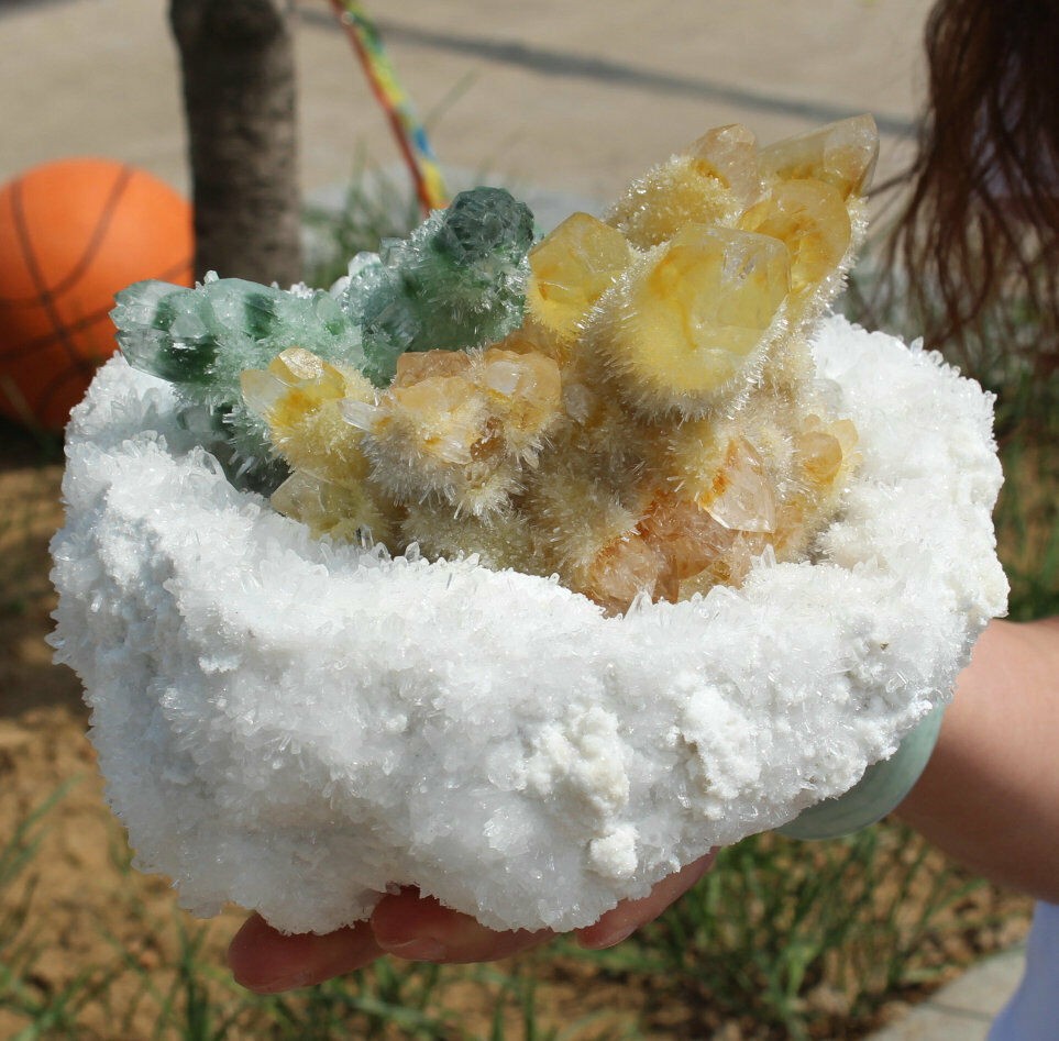 13. Bonjour, Ce sont des pièces qui sont apparues chez les vendeurs chinois il y a quelques temps. J'ai toujours eu un doute à leur sujet. Les tout petits cristaux me font penser à une croissance en laboratoire.... Possible d'avoir une photo du dessous de la pièce ? On ne verrait pas de longues stries par hasard? Comme si la pièce avait été posée sur une grille métallique ? Le quartz jaune posé dessus est aussi, à mon sens, indicateur d'une fraude. Tous les échantillons que j'ai vu avaient un quartz jaune posé pile poil au bon endroit.... très esthétique ! Malheureusement, la nature est beaucoup plus capricieuse que ça et a horreur de la perfection (d'où la rareté des minéraux avec des formes parfaites). Je suis désolé mais je pense qu'il s'agit d'un faux. D'autres auront peut être un avis différent du mien ? Je rappelle que mon analyse est purement visuelle puisque je n'ai jamais eu une de ces pièces en main. Bonne journée. edit: une petit recherche sur un célèbre site d'enchère permet de trouver des pièces dont certaines sont plus que suspectes: