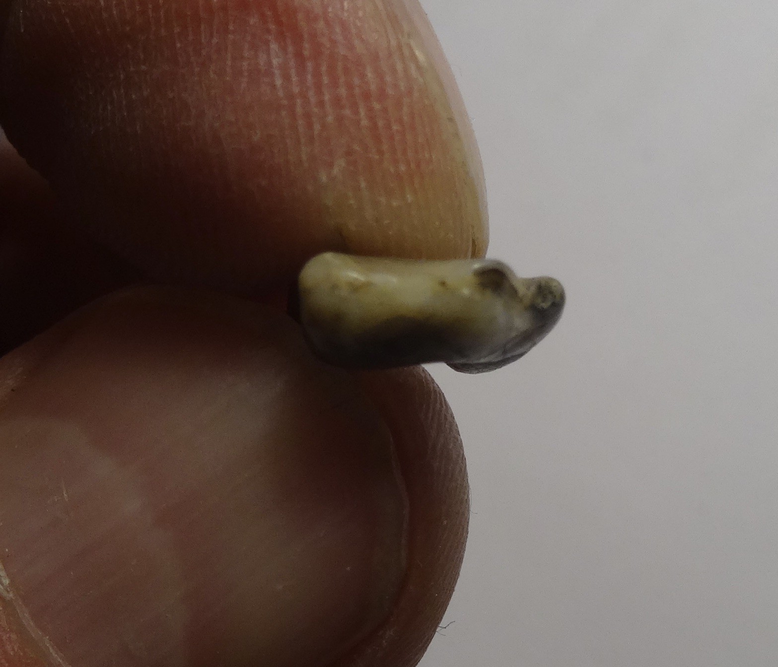 Bonjour j'ai tout de même montré ma petite dent à un paléontologue du museum réponse: il s'agit d'un fossile, une une prémolaire inférieure droite, p3 ou p4, d'un "condylarthre" ou moins probablement un hyaenodonte. j' le mail est parti trop vite: j'ai entretemps retrouvé la provenance: Lutétien de Chaumont en Véxin les fossiles marin qui l'accompagnaient sont joints -