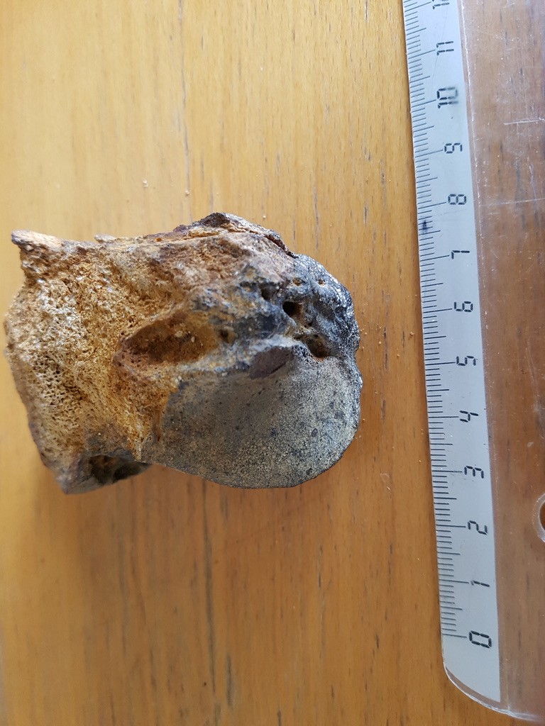 Voici 3 photos d'une deuxième extrémité d'os trouvée au même endroit, mais pas en continuité avec le précédent; os du pied? phalange de gros animal? l'autre fragment me fait plutôt penser à un os long; visuellement, on a affaire au même matériel; le premier os a une petite plaque de corail/madrépore attachée, visible sur deux des photos, donc j'imagine des os amenés en mer par une rivière/estuaire -