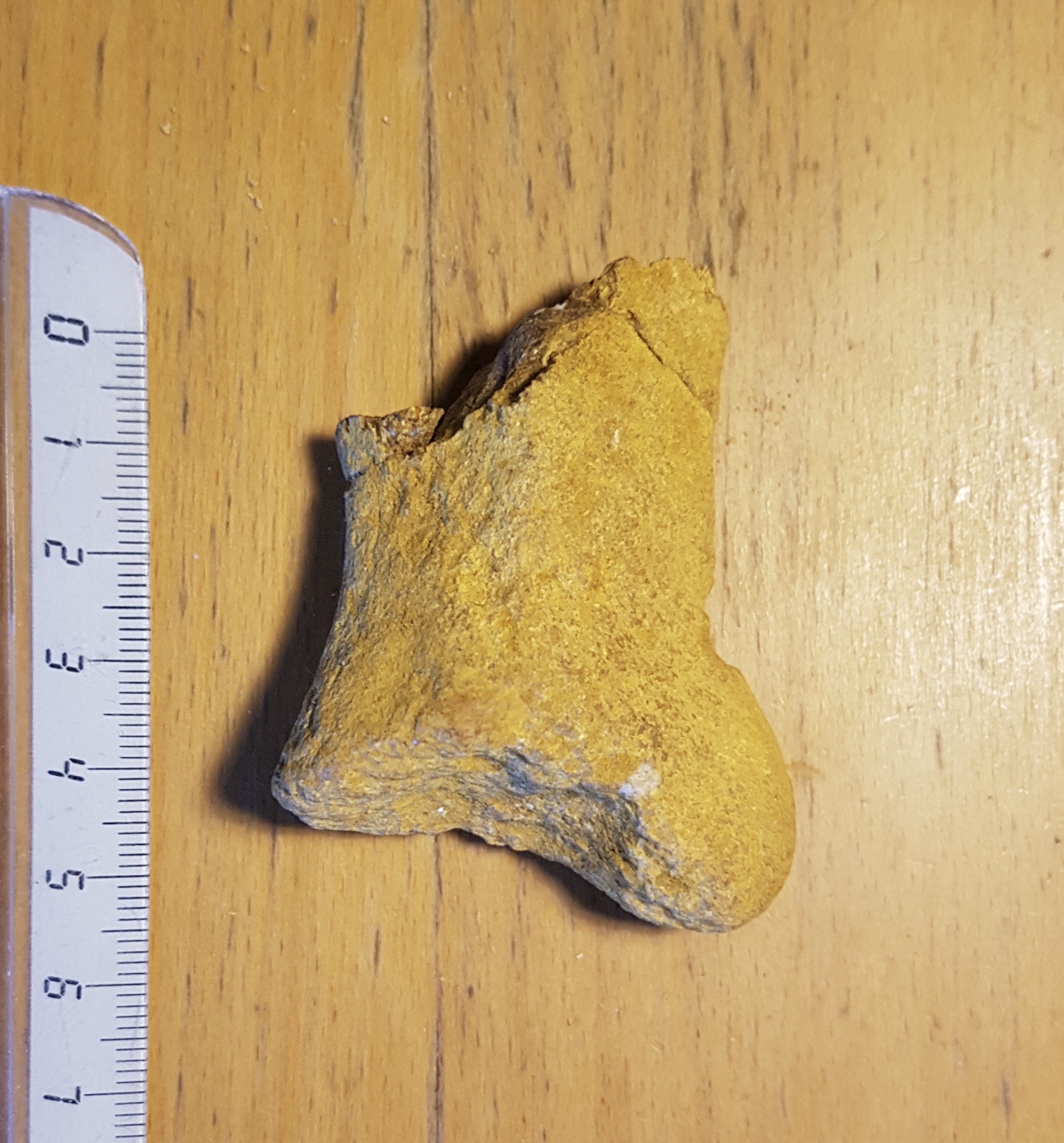 Bonsoir, vous avez tous les deux instillé le doute dans ma mémoire; après tout, c'était il y a 40 ans et peut-être me suis-je trompé sur le ou les sites: c'est vrai que l'aspect des os clairement remaniés et celui de la dent très préservé sont très différents. Donc je vais vérifier avec les amis qui m'avaient emmené (j'étais ado à l'époque), peut-être ont-ils pris des notes. Dommage pour les os, j'avais un petit espoir d'identification pour le plus gros, la prochaine fois j'essayerai de ramener un os complet! et pour karoo, une photo de la molaire avec la règle - moins floue :-) en plus du plâtre qui remplace la racine, l'émail de ce côté-là a été légèrement rafistolé Amicalement -