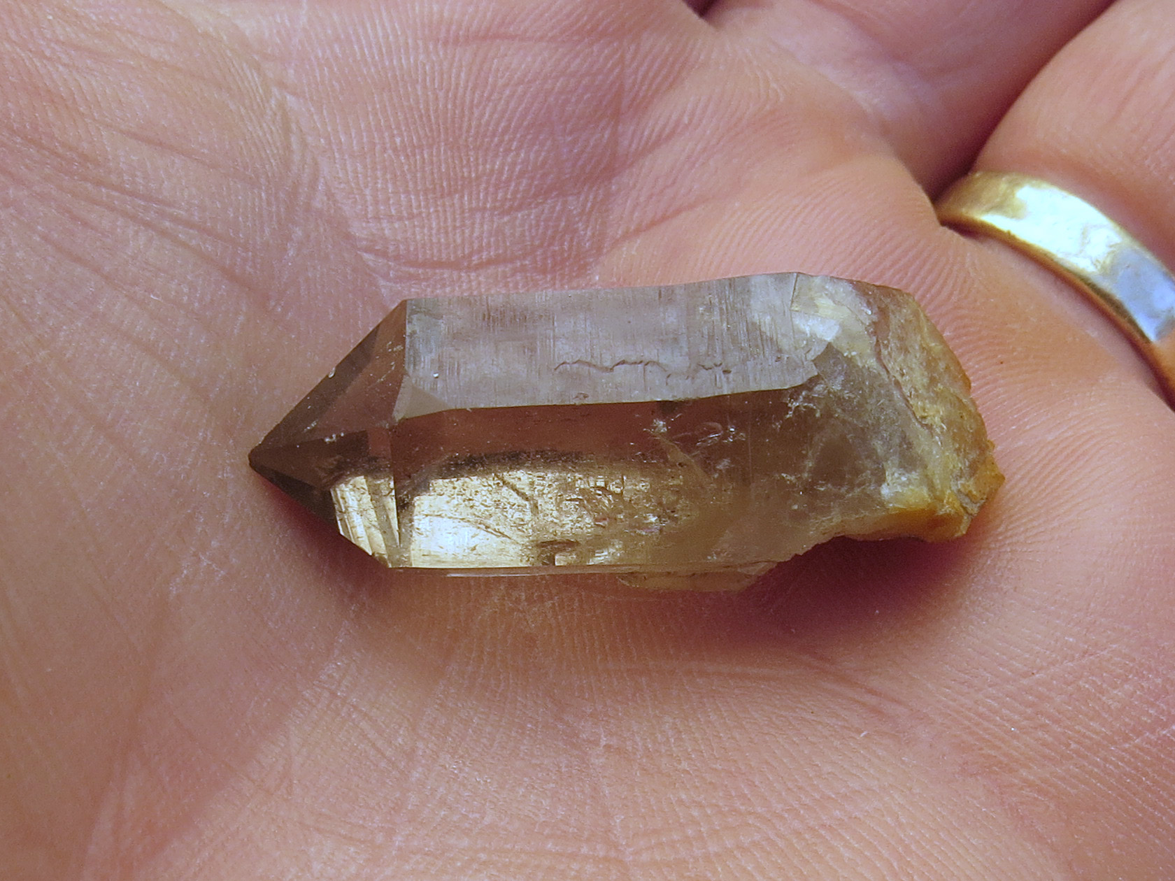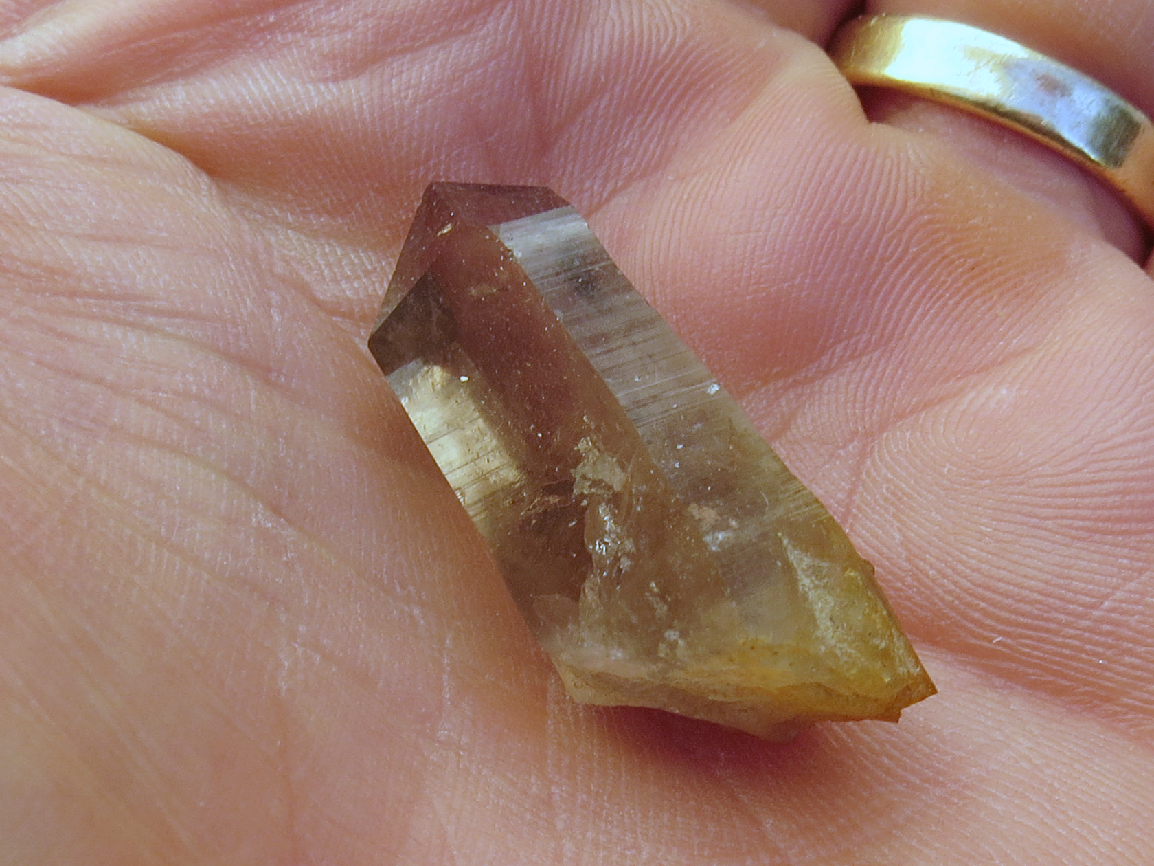 J'ai fait un test de rayure sur le quartz et ça raye bien celui ci. Ensuite je l'ai éclairé par dessous. C'est marrant comme il parait du coup beaucoup plus clair avec comme une sorte de tache diffuse de couleur vert/jaune. Pléochroïsme ? -