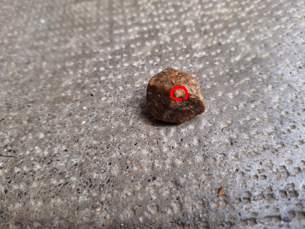 Une vue rapprochée du pét' entouré en rouge arrangerait. Ca fait almandin pierreux... de loin. D'autres personnes bien calées en cristallographie devraient pourvoir dire si en extrapolant les "facettes" ca pourrait être un grenat. Ce qui me tracasse un peu c'est cette zone qui fait trop quartz pour que ce soit un grenat (la couleur m'inspire pas non plus), à moins qu'il soit très fourni en "impuretés". Ca arrive, gros grain de quartz / biotite etc mais la ca semble sacrément chargé. -