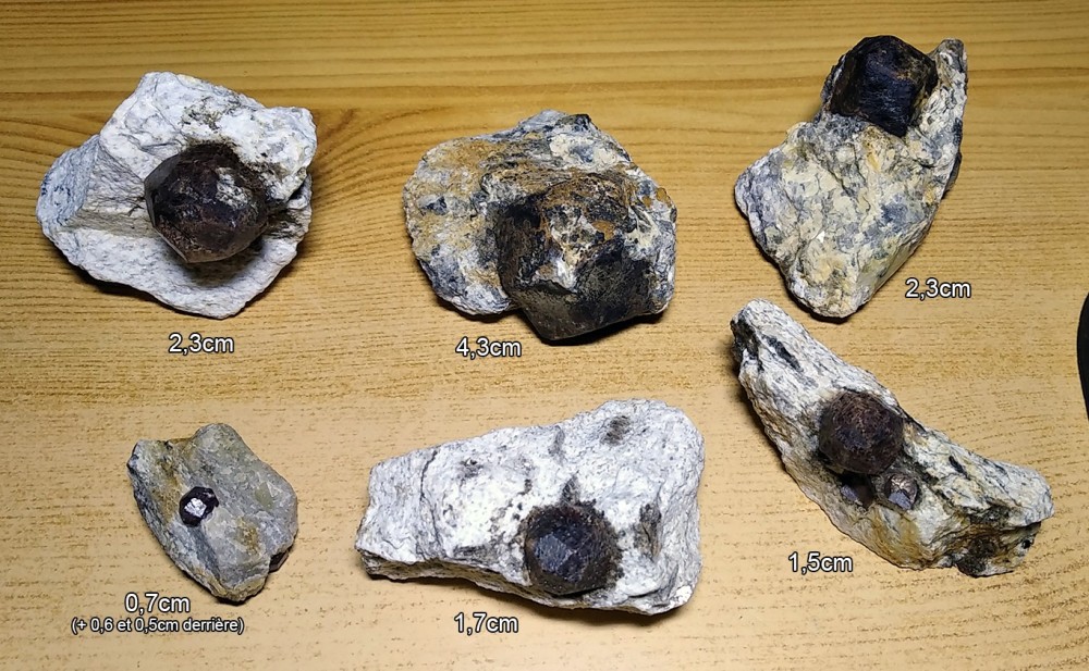 L'oeil du tigre . Tu m'avais deja fait la remarque à Narbonne. Ils proviennent d'un petit spot dans le secteur de Belesta où avec mon ami grenat66 nous avions trouvé pas mal de choses louches (pour nous). 2 cristallisations très différentes à quelques centimètres d'écart. Grenats marrons clairs/foncés/rosés côte à côte ! Je peux t'envoyer le lieu de prélévement en MP si tu le souhaites. Voici quelques photos de 9 spécimens du site en question. -
