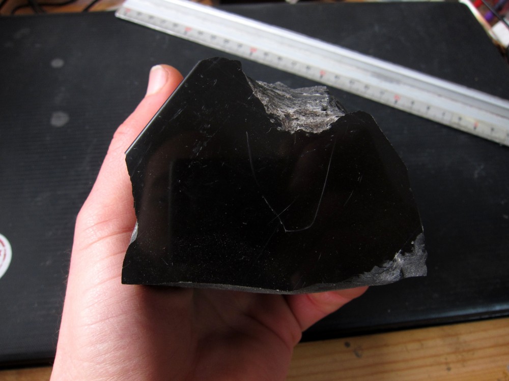 Bonjour et bonne année à tous (en tout cas meilleure que la dernière) On m'a récemment donné un cube (15cm de coté) de pierre noir, photo 1 et 2 (nommée marbre mais que je soupçonne d'être du calcaire vu l'aspect de la cassure, en tout cas c'est du carbonate vu la réaction à l'acide) et comme je n'en ai pas d'utilité en l'état et en tant que lapidaire j'ai essayé de la tailler. A ma grande surprise j'ai vu une espèce de liquide d'aspect huileux de couleur marron qui se dégageait de la boue de taille, photo 3, avec une odeur très particulière (ça m'a fait pensé à du sulfure d'hydrogène ou l'odeur du gaz naturel). Ma 1ere réaction a été de penser que j'avais affaire à une pierre teintée (je précise que je ne connais pas bien les processus ni les liquides utilisés pour les teintures des calcaires). Mais en faisant quelques recherches, je suis tombé sur le calcaire noir de Golzinne, un calcaire qui serait de couleur noir à cause de la présence de matière organique (mais je n'ai pas trouvé sous quelle forme de MO il s'agit dans ce cas précis). Alors serait-il possible que je sois dans le cas d'une teinture naturelle due à des hydrocarbures ou assimilés? Ou pensez-vous plus à une teinture artificielle? Et selon le cas, comme cette pierre finira en bijoux, pensez-vous que le contact avec la peau puisse poser problème? Merci Cassure fraiche Zone polie à l'origine Liquide sortant de la pierre qui a l'aspect de taches d'huile