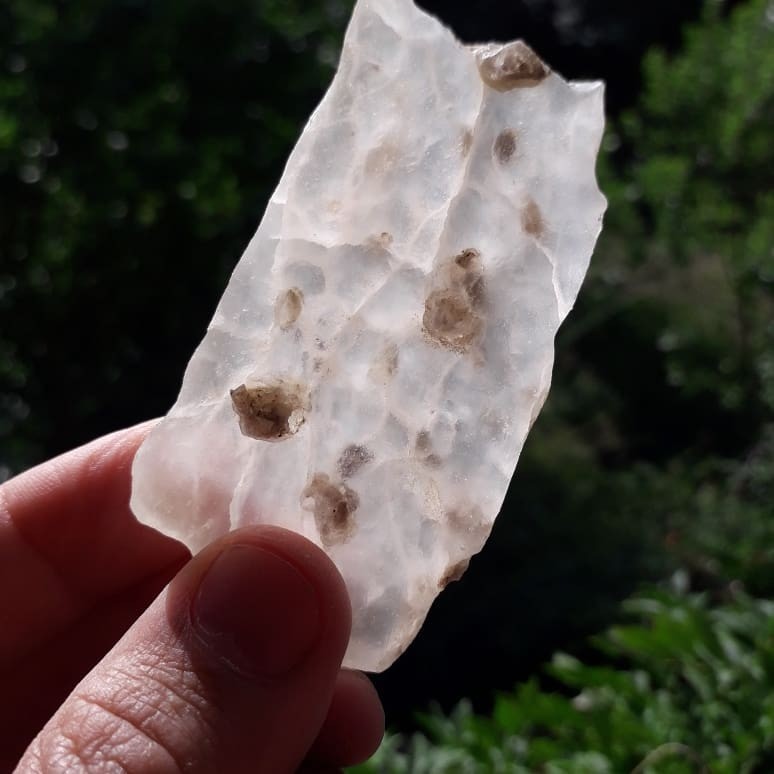 de "petits" grains noirs brillants de biotite (?) (certains font 2 cm de long); de gros cristaux noirs à l'éclat un peu métallique faisant parfois près de 10 cm, maclés ou interpénétrés de façon diablement géométrique, et ce que j'imagine être des grenats d'une grosse taille, d'une belle couleur, bien formé, et parfois assez limpides. Quelques filons cristallins (quartz) parcourent quelques dalles...