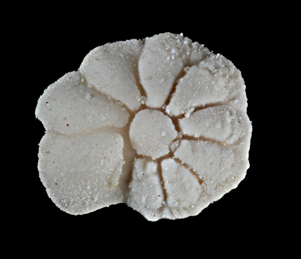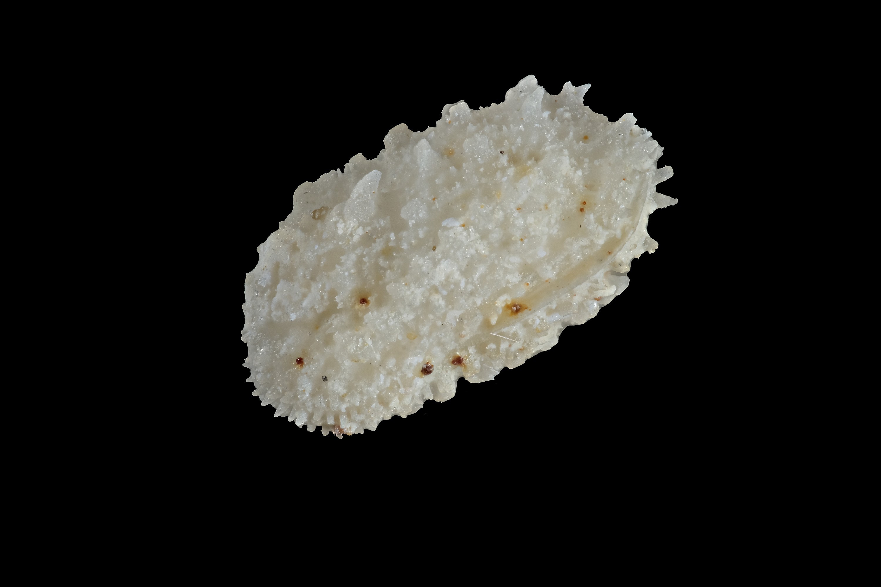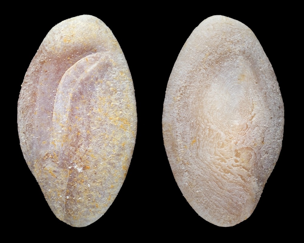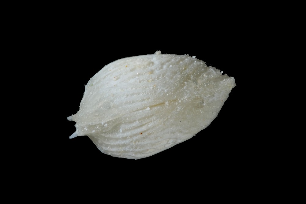Toujours du même échantillon, un ostracode qui est une horreur à photographier ! (des détails blancs sur un fond blanc, ce n'est pas terrible au point de vue contraste d'où le gros bricolage en post traitement).