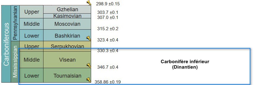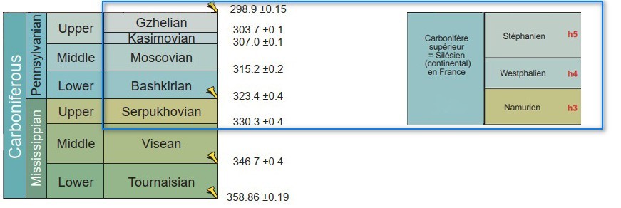 Calamites du Stéphanien de Decazeville (largeur de la photo 530 mm) Niveau à cinérites du Stéphanien de Blanzy Palaeocaris secretanae dans un nodule de sidérite du Stéphanien très supérieur de Montceau-les-Mines Fougère dans un nodule de sidérite du Stéphanien très supérieur de Montceau-les-Mines Petit actinoptérygien dans un nodule de sidérite du Stéphanien très supérieur de Montceau-les-Mines -