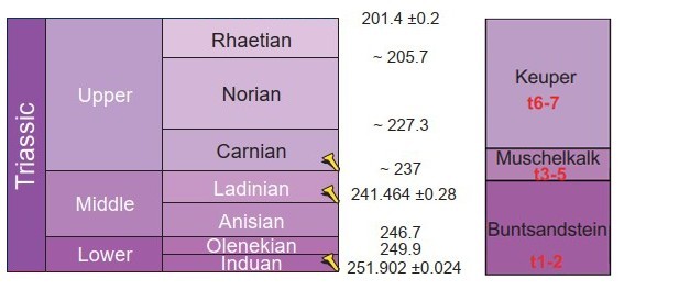 Pour le Rhétien : ichnofossiles de Meloisey (Côte-d'Or) : On peut d'ailleurs se poser la question de savoir s'il s'agit d'ichnofossiles quand on observe certains détails : -