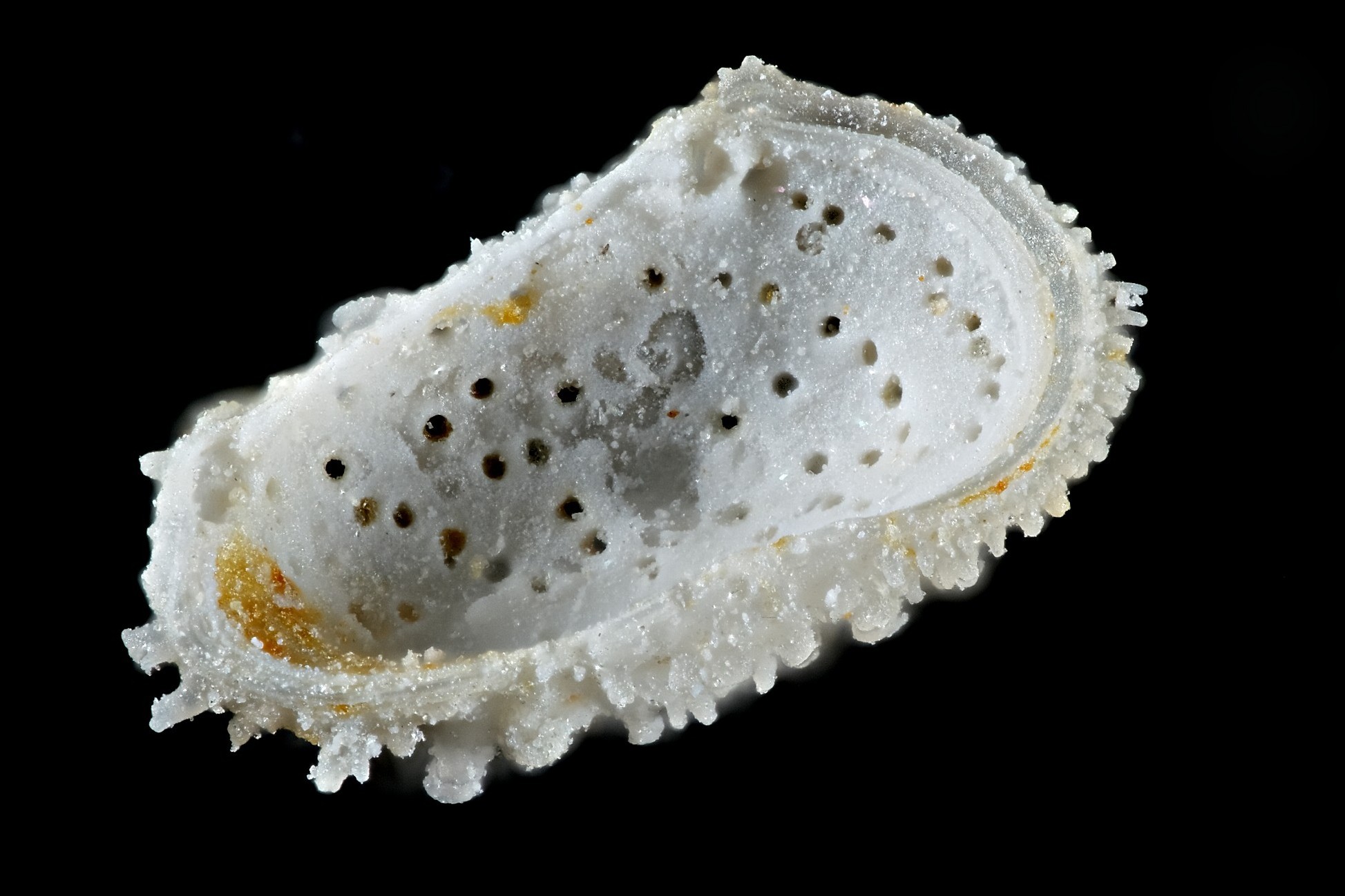 Une valve isolée d'ostracode du Guépelle légèrement endommagée qui montre les perforations internes.