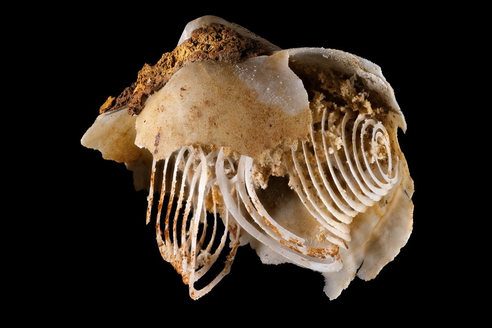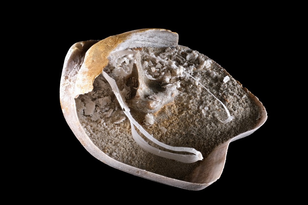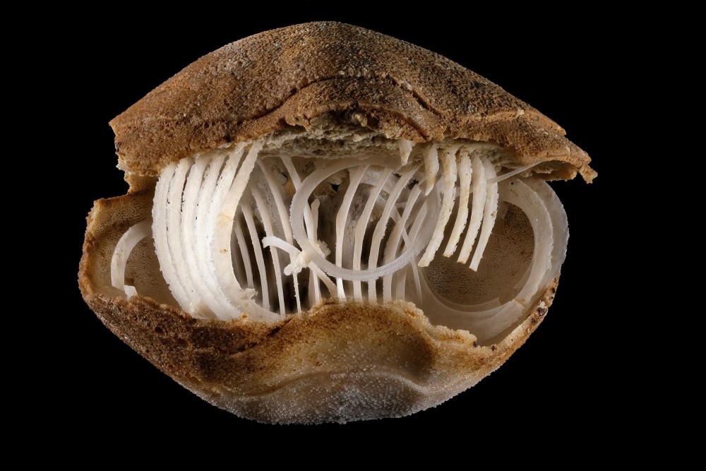 4. Une autre Zeilleria cornuta. Si on se base les évolutions de nomenclature, Z. cornuta est un synonyme de Z. quadrifida. Dans certains gisements, on trouve des passages continus entre les deux espèces (mais pas dans l'Indre). Le gros problème dans l'Indre, c'est qu'on ne trouve que des Z. cornuta typiques et quelques Z. quadrifida typiques (rares), sans aucune transition entre les deux. Et, pour couronner le tout, on trouve des formes de transitions entre Z. cornuta et Z. moorei ! Si vous arrivez à suivre, moi pas 😁. Comme d'habitude, le bazar le plus total, ce qui ne nous empêchera pas d'admirer l'intérieur de cette coquille.