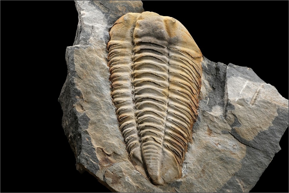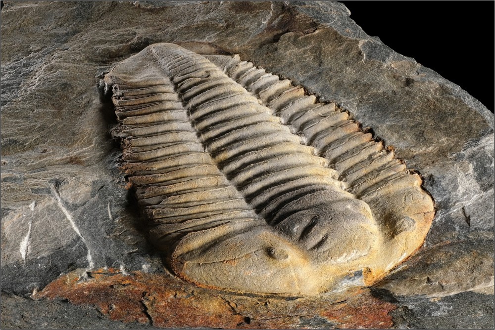8. Colpocoryphe rouaulti : une espèce classique de l'Ordovicien de Bretagne et de Normandie, mais pas seulement. Cet exemplaire provient des Monts de Tolède (Espagne). La faune associée est identique à celle de France (malgré le millier de km séparant aujourd'hui ces deux régions). Longueur 55 mm Vue antérieure