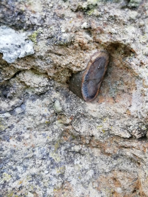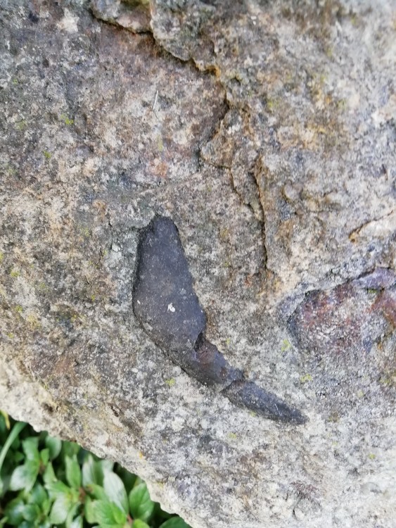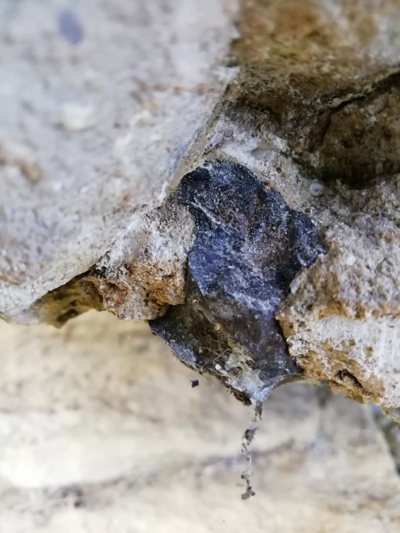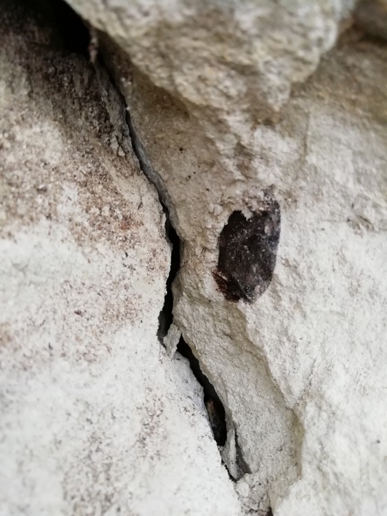 Bonjour, de récentes chutes de pierre ont permis de mettre au jour de nouveaux fossiles. Malheureusement cette vertèbre était dans les blocs au sol et en sacrément mauvais état. J'ai repéré le reste du corps de la vertèbre dans la falaise un peu plus haut mais très difficilement sortable sans tout casser (à bout de bras et en équilibre...)