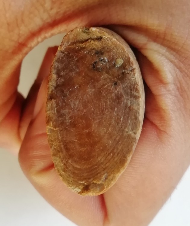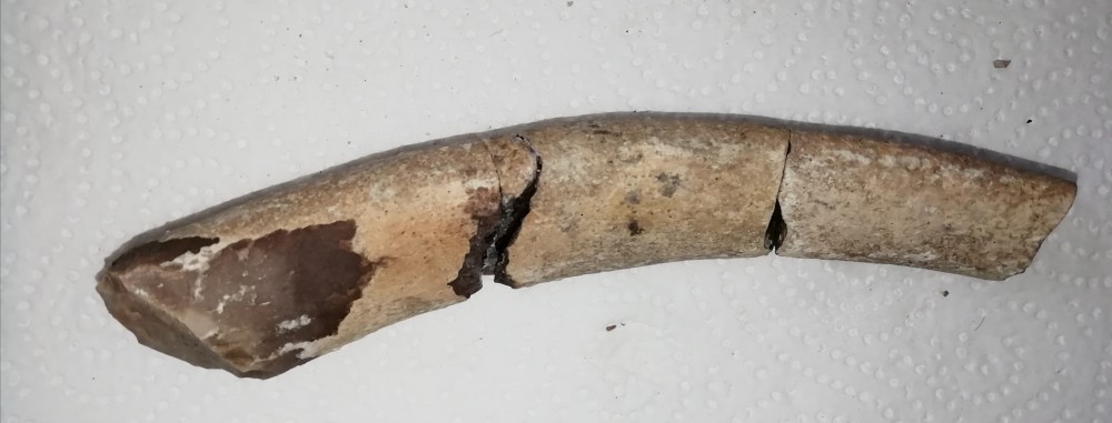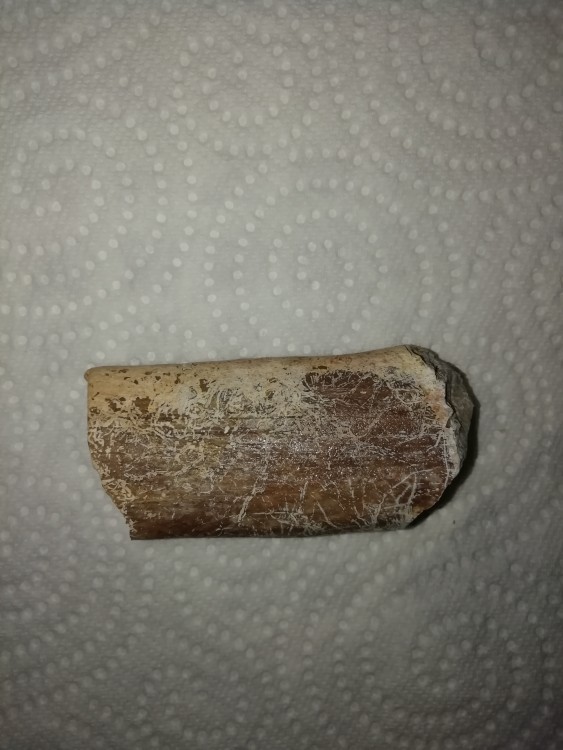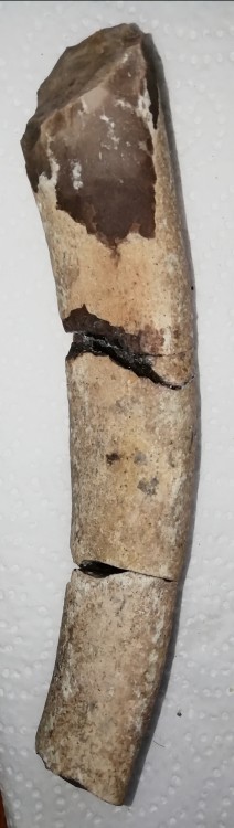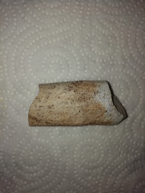 Bonjour à tous, Voici ce que je pense être un fragment de côte trouvé dans la couche des marnes à Ostrea dans l'entre deux mers girondin, qui est théoriquement de l'Oligocene inférieur selon la notice. Les Ostrea sont bien présentes avec des individus assez énormes. L'affleurement est tout petit mais bien en place (pas de remaniement visible), avec une couche argileuse d'où est issue la supposée côte. La taille est d'environ 8 cm de long. Non loin il y a du Paleotherium de cité d'une couche Eocene supérieur, qui se situe tout de même bien plus bas que celle à huître (d'ailleurs aucun ossement n'est donné dans ladite couche à huîtres sur la notice). Est-ce possible de l'associer avec une espèce ? (toujours dans l'optique qu'il s'agit d'une côte) Autre question, pour la photo il est légèrement humide mais lorsqu'il sèche l'argile donne cet aspect : Sauriez-vous comment retirer l'argile ? Merci d'avance !