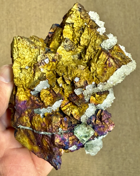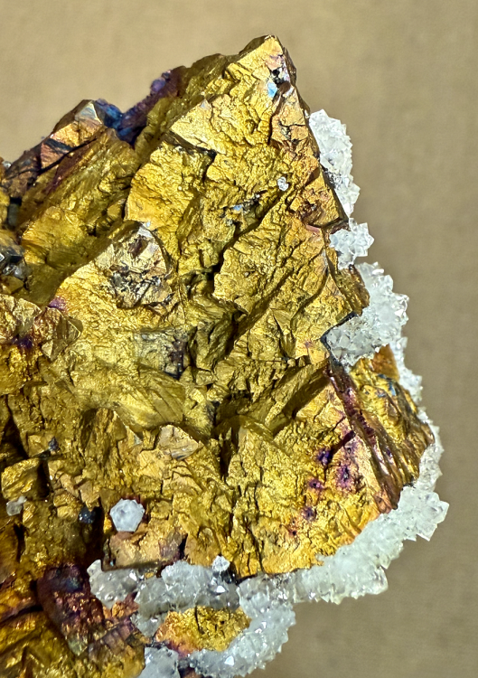 Il y a une grande diversité, les cristaux peuvent montrer une surface non oxydée comme mon spécimen, qui a été simplement été traitée comme un sulfure ; il y a des cristaux bleus, comme le spécimen ci-dessus ; il a des cristaux recouverts d'un film vert, avec des nuances de jaune, que j'ai fait vérifier, il s'agit de malachite et non pas d'un sulfate : ceux-ci peuvent supporter des cristaux centimétriques maclés de chalcocite ; il y des cristaux profondément oxydés, comme ci-dessus où le décapage ne semble pas motivant… Et sans doute encore peut-être d'autres faciès. -