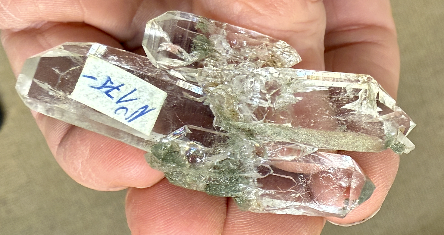 A la mémoire de Michel Maigrot Quartz fantôme ; ferro-chlorite sans doute riche en Mg (une partie des formations verdâtres pourrait être de la Cookeite) ; cristal cassé cicatrisé. [55mm] Trou de la Fée -
