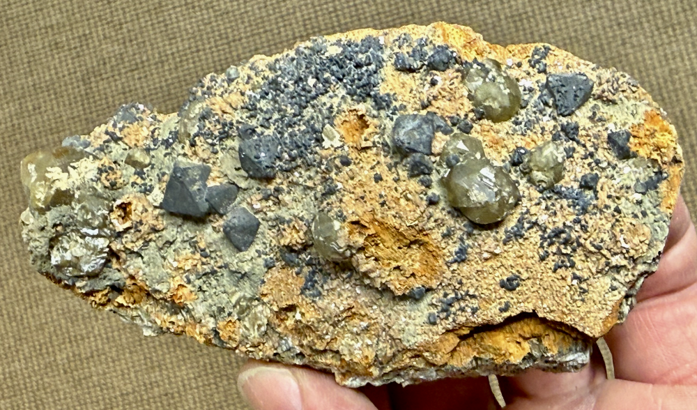 Tétraèdrite en cristaux tétraèdriques centimétriques implantés dans la Chalcostibite prismatique, Zinkénite en cristaux prismatiques striés ; Sidérite [100mm] Affleurements des Italiens, Saint Pons