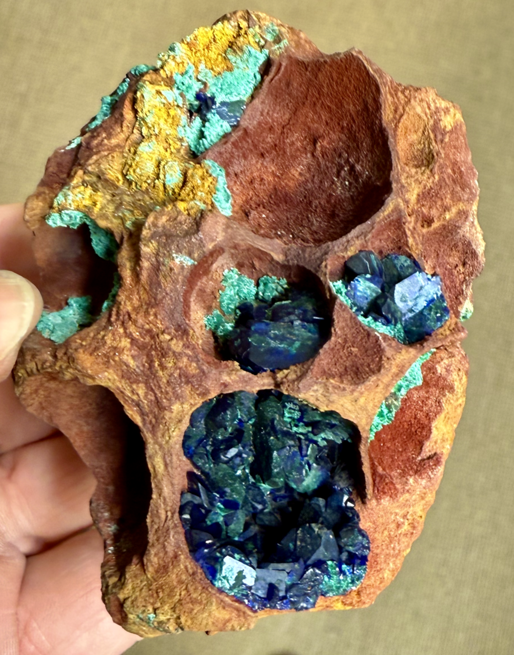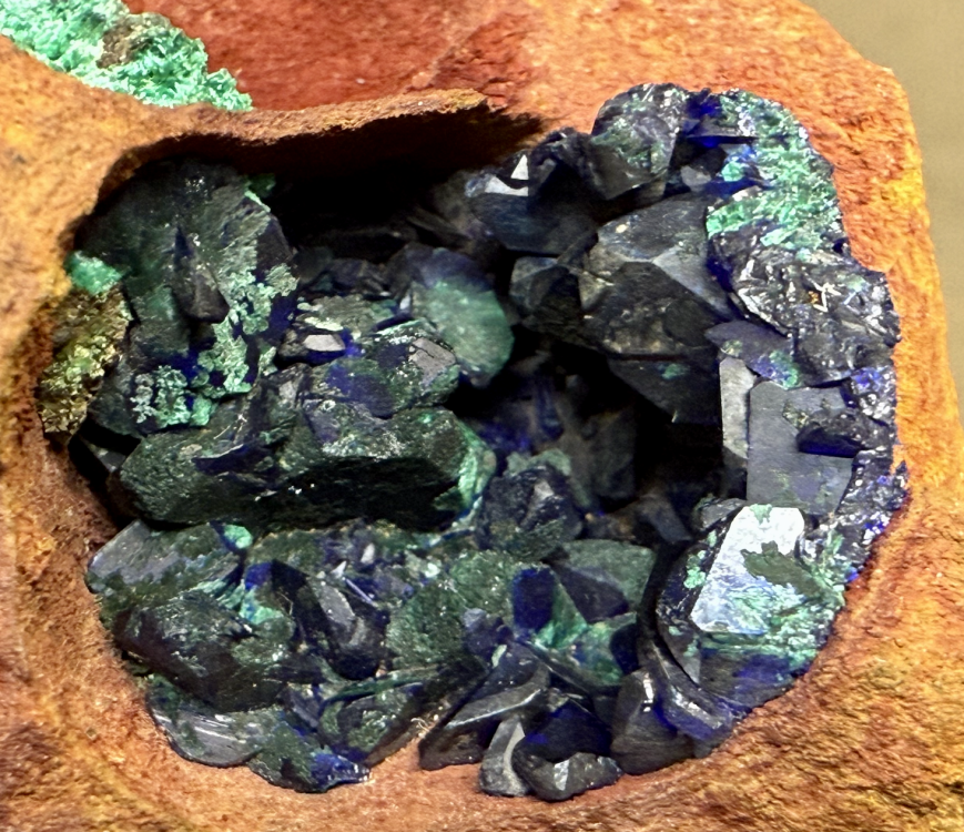 Je publierai et republierai de la galène provenant du gisement historique Malachite pseudo en épigénie de la Cuprite octaédrique dans une masse d'Azurite cristallisée en sphérules crêtés centimétriques [80mm] Epoque mine Les association cuprite pseudo - azurite sont rares ; il y a un spécimen de qualité stratosphérique exposée au BMNH. Anc. coll. Vésignié et MNHN avec son numéro 171-290