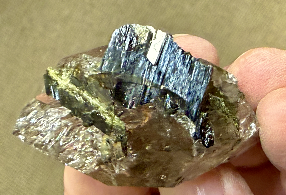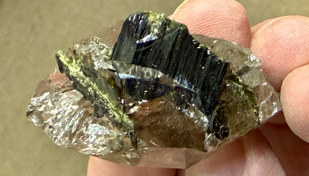 Épidote en cristaux tabulaires partiellement inclus dans un cristal de Quartz un peu enfumé, bi terminé. [35mm] Talèfre -