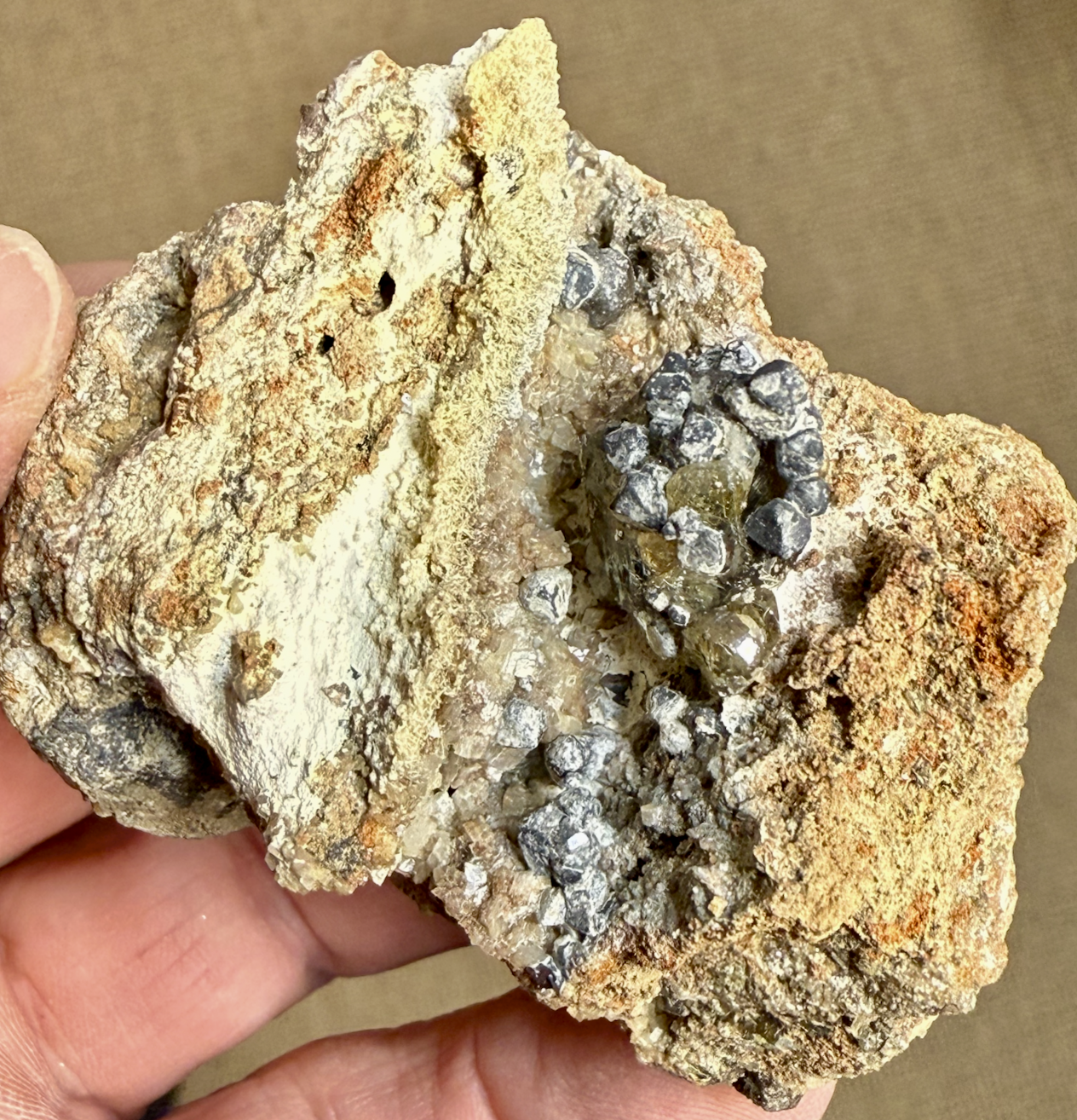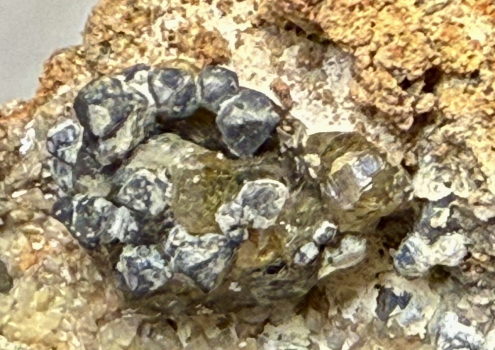 Galène en cristaux octaèdriques arrondis formant une courrone peut-être épitaxique sur un cristal de Blende cleiophane ; Hydrozincite (?) [90mm] La Pereire -