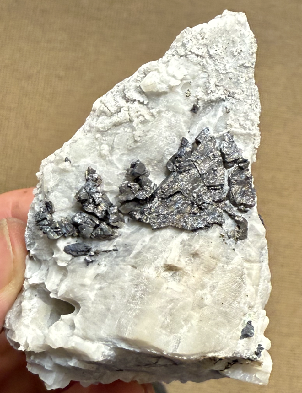 Stibine en cristaux aciculaires ; Stibine en micro-cristaux tapissant le Quartz calcédonieux. [150mm ]Mine de La Forge, Anzat-le Luguet, époque mine -