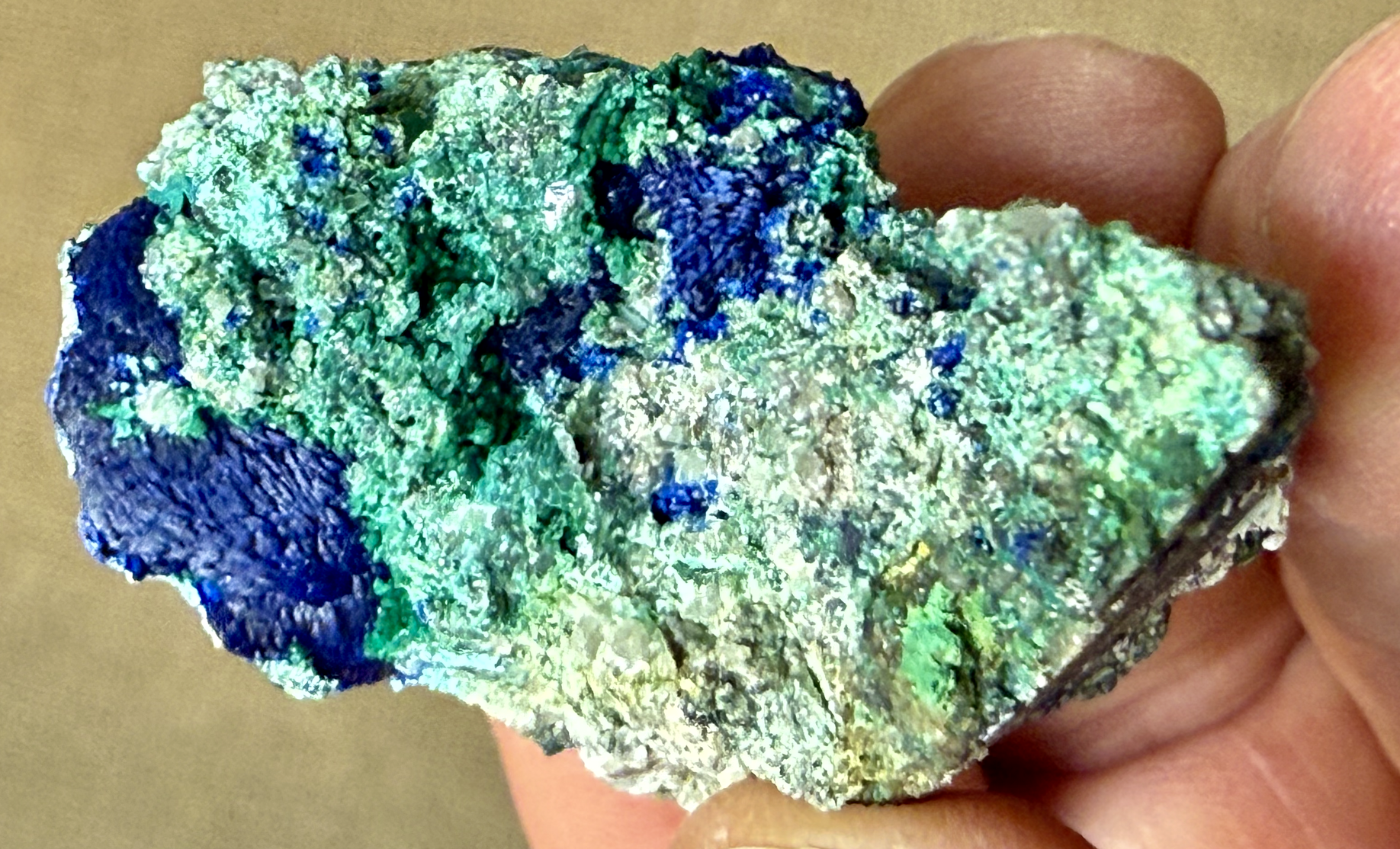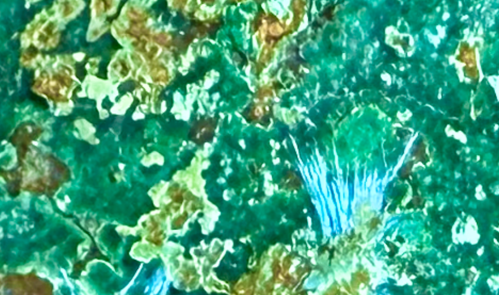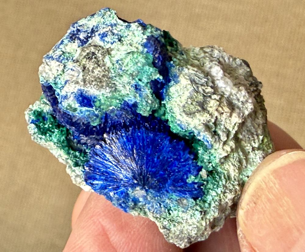 Azurite en sphérule fibro-radié centimétrique bleu et Malachite ; Posjnakite (?) [35mm] Hubac de Jourdan -