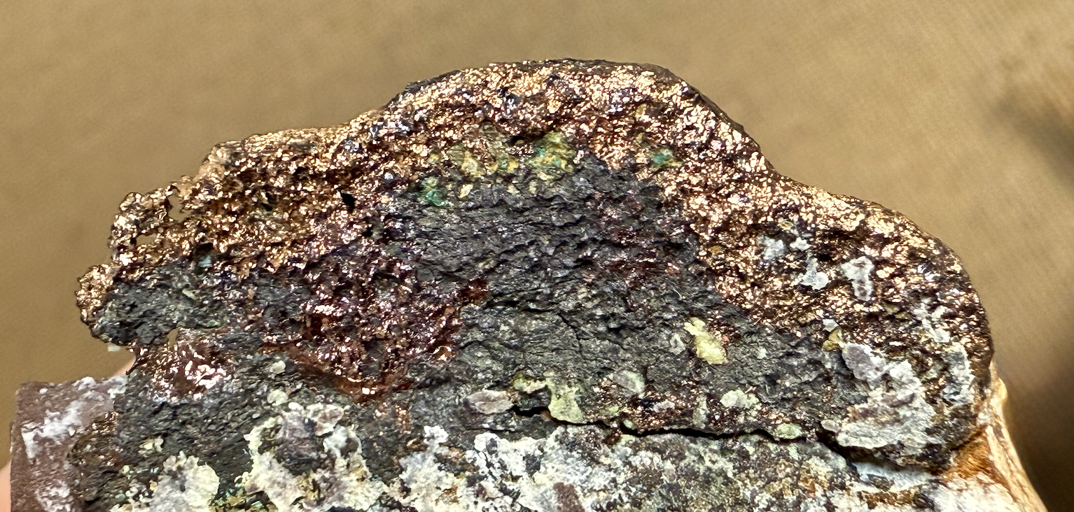 Un gros nodule alors, car la gangue et le remplissages sont très désagrégés, et cette "boule" , agrégée par les carbonates de cuivre, avait été peut-être oubliée par les "mineurs"… -
