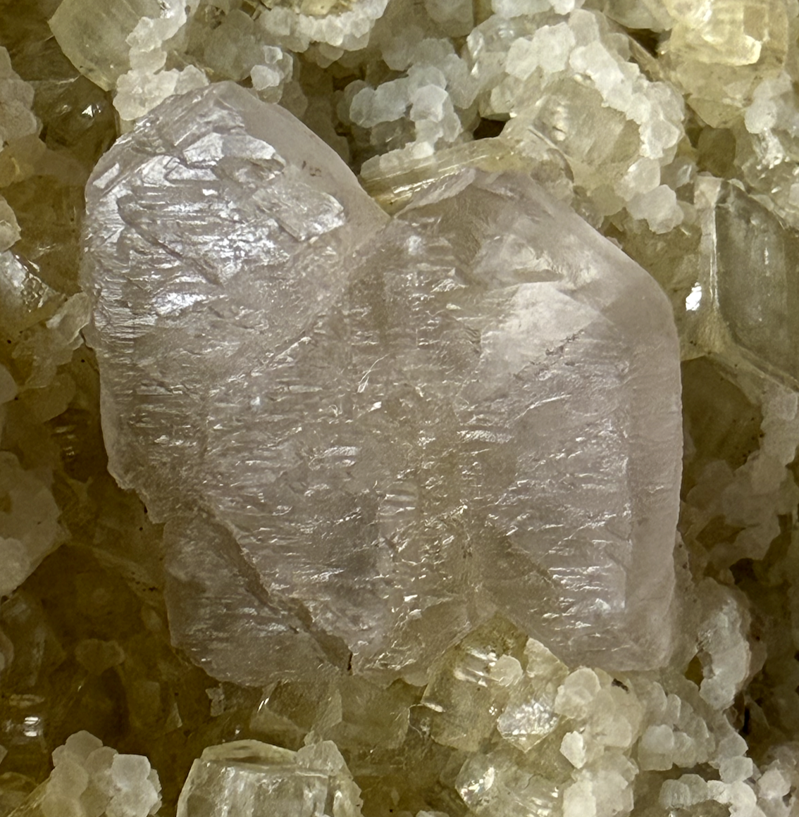 Barytine , localement nommée Baryto- Célestine, à vérifier, en criustaux tabulaires légèrement violacés, avec Dolomite, Calcite et Quartz dauphiné [180mm] Fontfraîche -