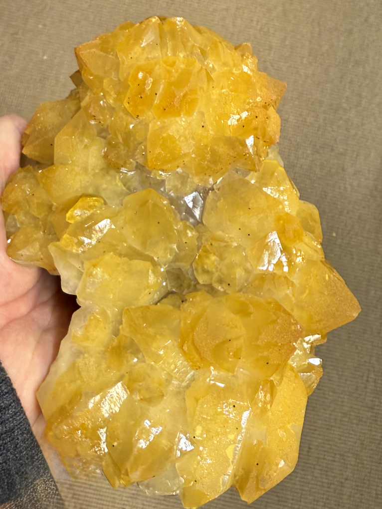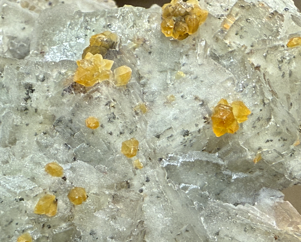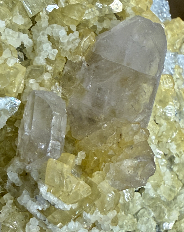Quartz pyramidal jaune, sans doute coloré par de l'oxyde de fer, sur Fluorine [125mm] Rocher du Boeuf -