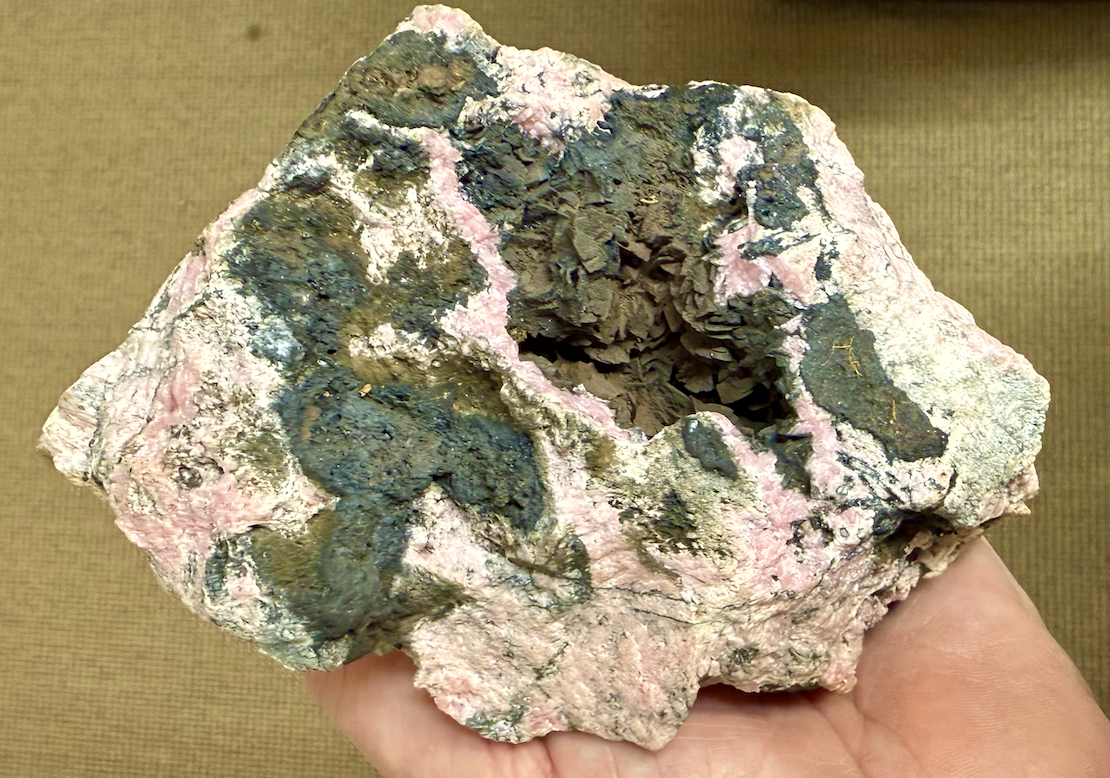 Hématite en roses, incrustée de Fluorine octaèdrique à peine violacée ; Adulaire (les petits cristaux blancs ; verif.) La Verte Déc. René Ghilini La fluorine déposée ici est très tardive, et n'a pas de lien avec la fluorine rose. Cette minéralisation en fluorine est la troisième à fluorine dans le massif. Cette fissure est toujours productive, il y a des magnifiques spécimens dans le commerce… -