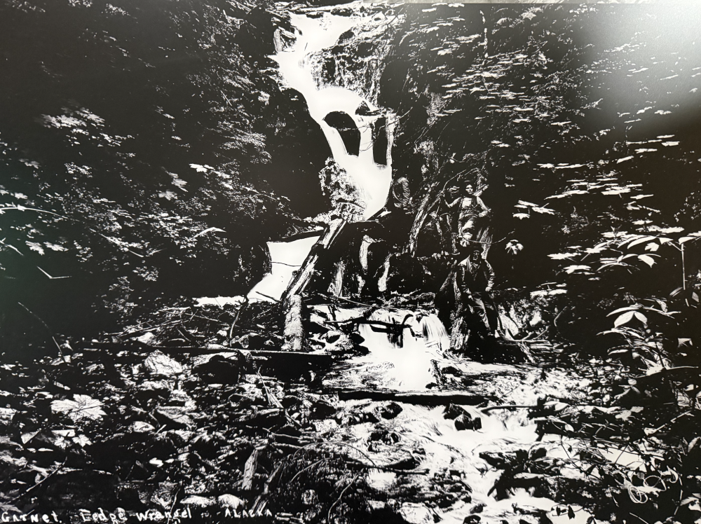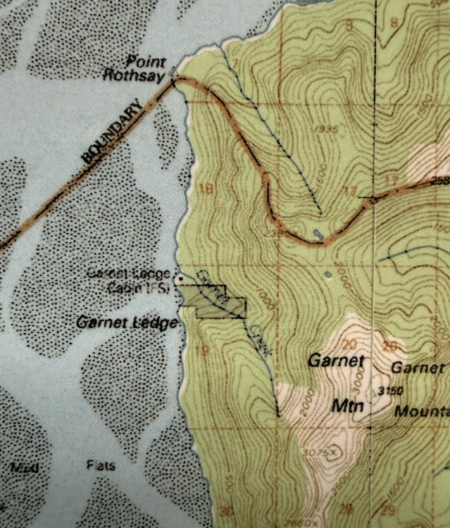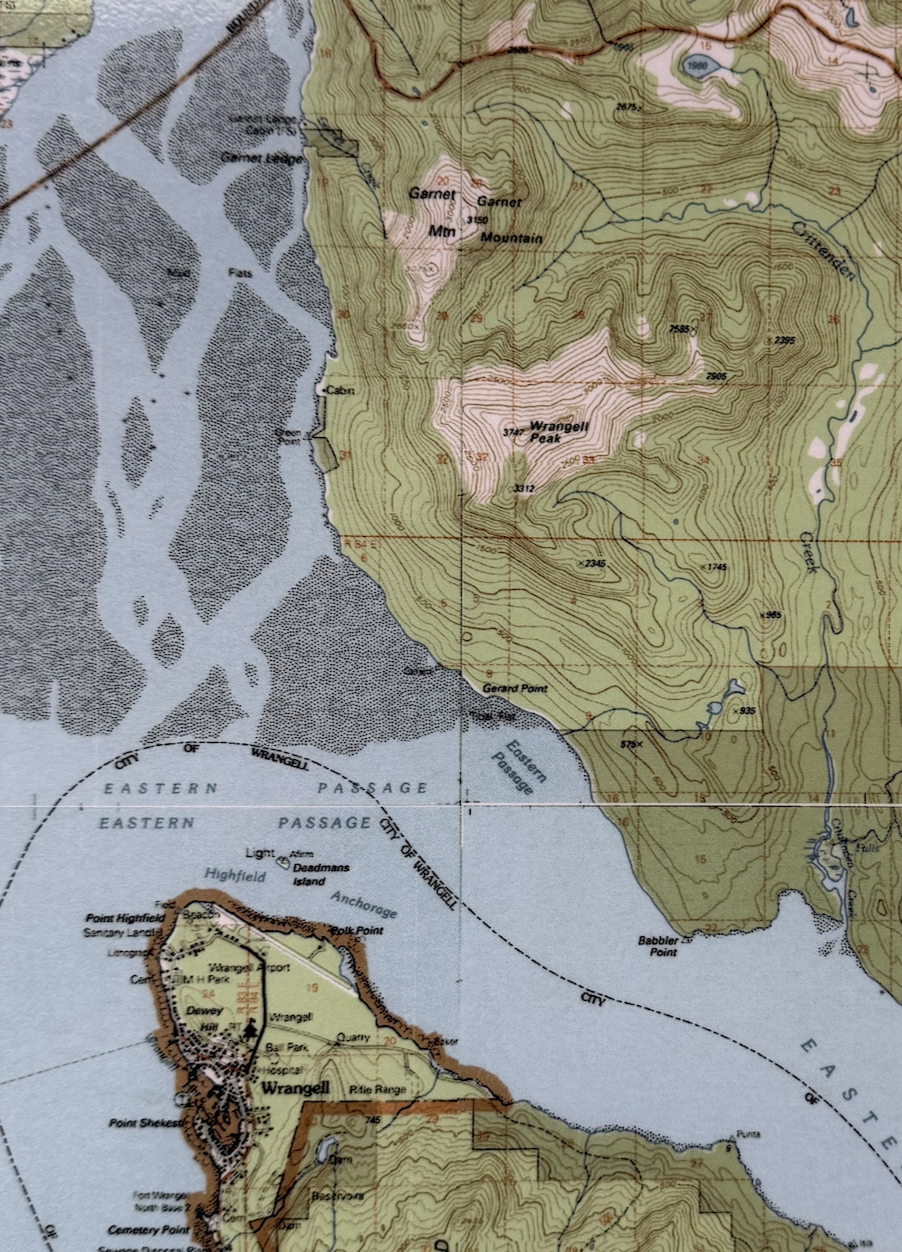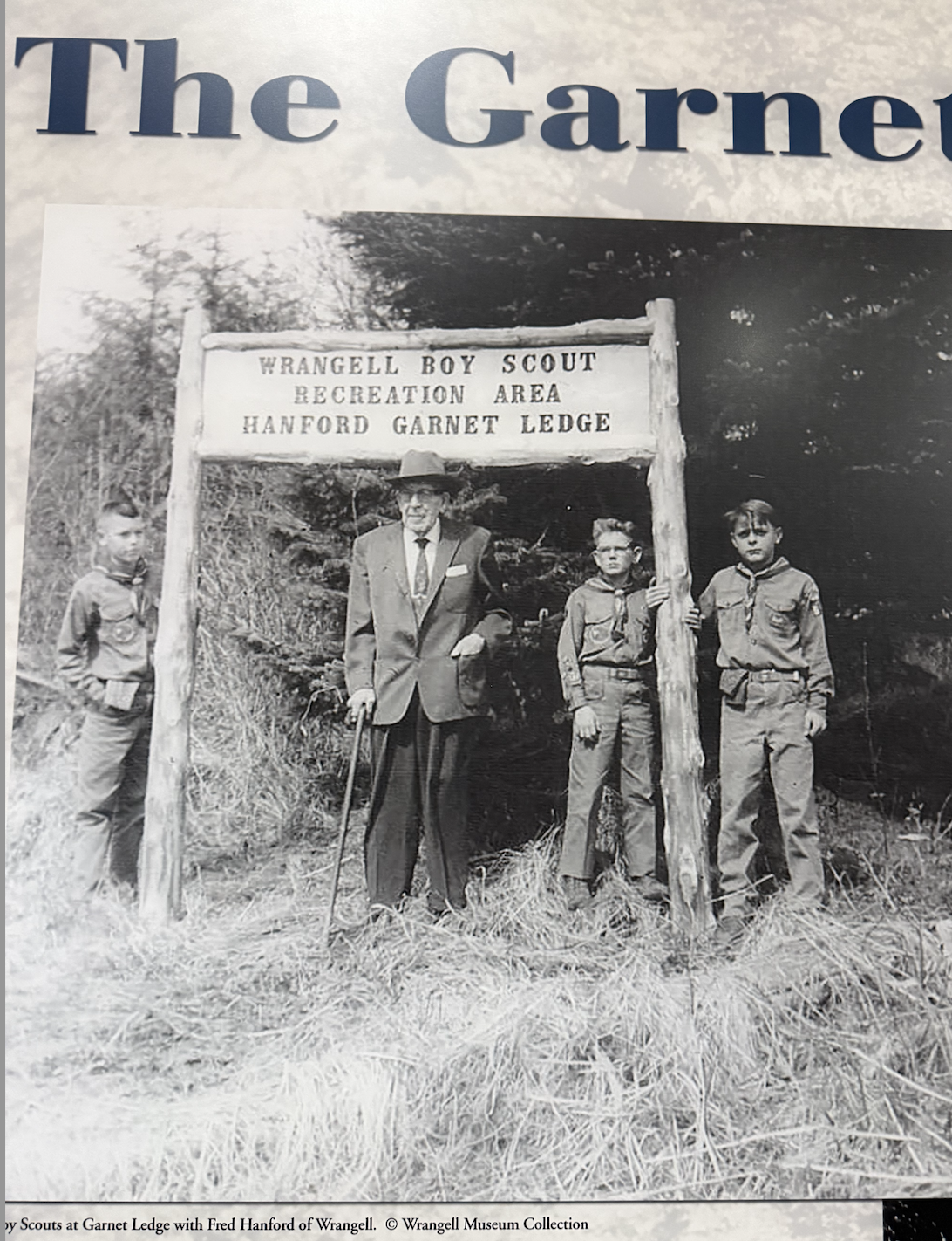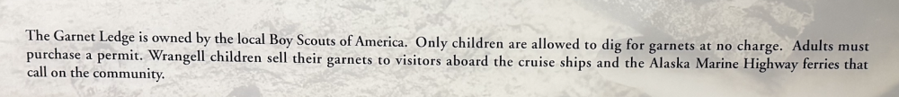 Le hasard des chemins m'a amené à faire étape à Wrangell au Sud-Est de l'Alaska. J'ai donc ouvert mindat et Almandin… La localité aux grenats est facile à trouver , elle est sur la carte marine : en environ 3 miles marin au nors de Wrangell Wrangell à cette saison n'a ni hôtel et un seul Air'BB où je résidais, loué par le proprio d'une des chantiers navals, dans la partie haute d'un des ateliers à bateaux. Toute affaires cessantes, il m'a trouvé un pêcheur capable de m'y amener… mais les icebergs sont alors trop nombreux et l'on ne pouvait pas naviger vers le Garnet Ledge... Sic Transit. Il y a un petit musée local, sociologique autour des Tinglit, le peuple premier fabriquant de totems… Le gisement lors de l'exploitation "industrielle" … pour la collection, au tournant XIXe:XXe Une cristallière Le gisement est donné au Boy Scout