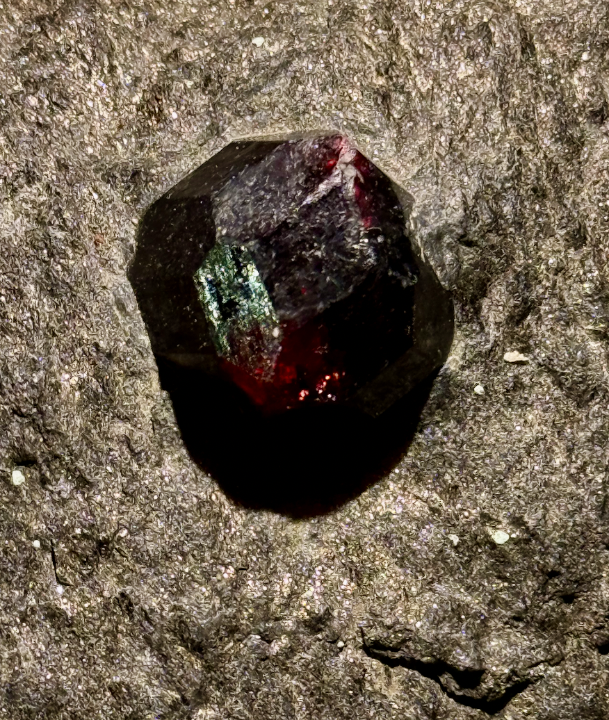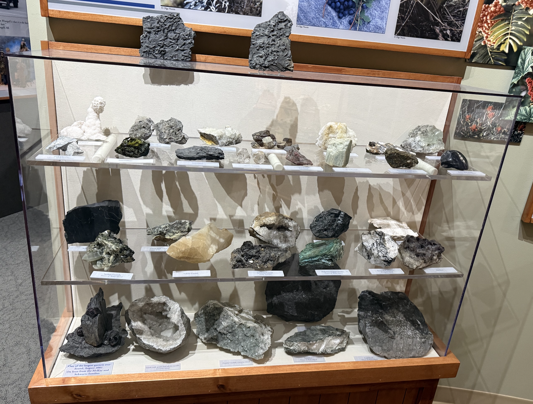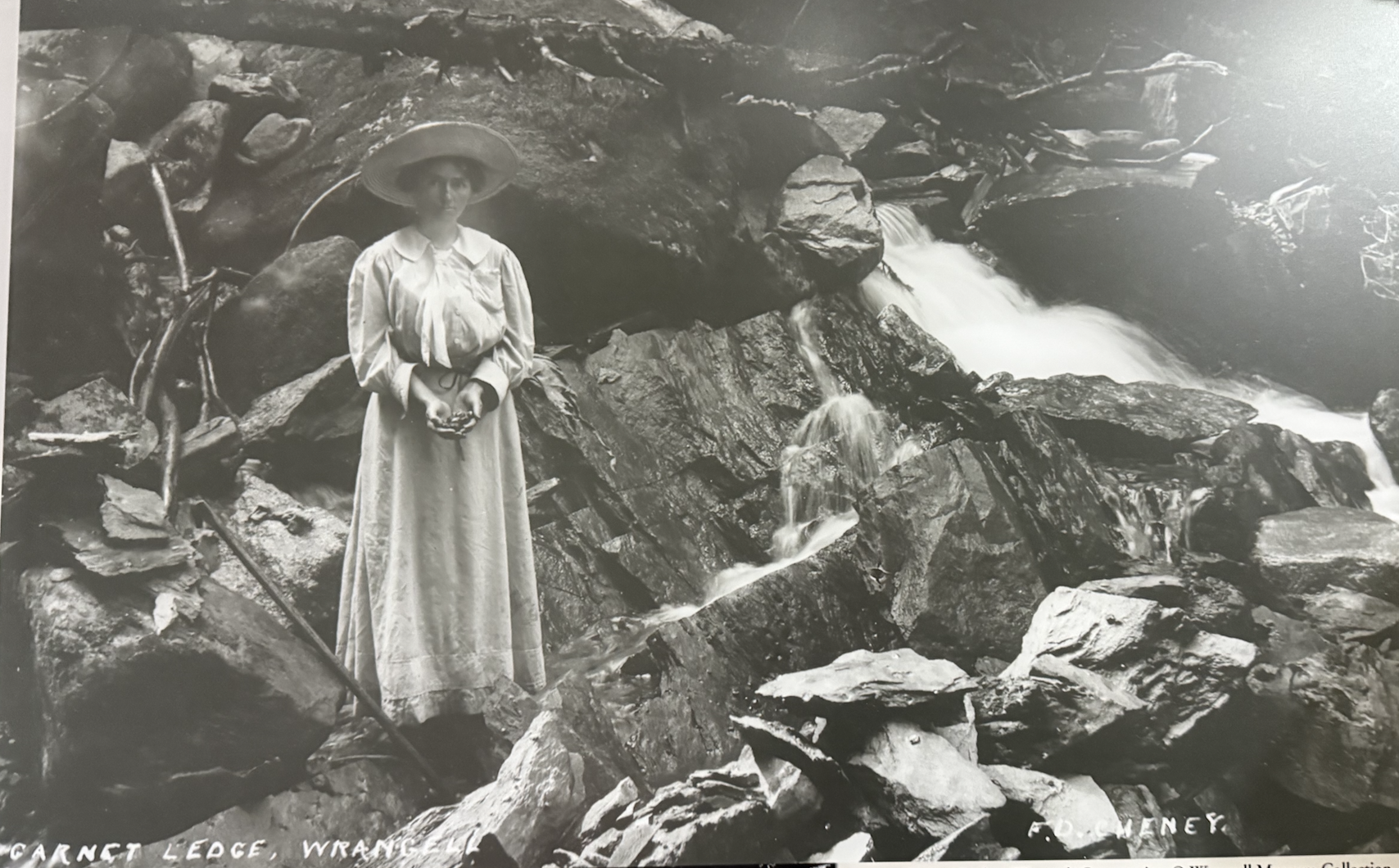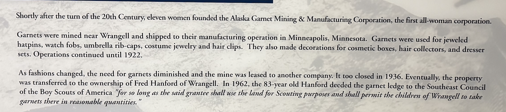 Le hasard des chemins m'a amené à faire étape à Wrangell au Sud-Est de l'Alaska. J'ai donc ouvert mindat et Almandin… La localité aux grenats est facile à trouver , elle est sur la carte marine : en environ 3 miles marin au nors de Wrangell Wrangell à cette saison n'a ni hôtel et un seul Air'BB où je résidais, loué par le proprio d'une des chantiers navals, dans la partie haute d'un des ateliers à bateaux. Toute affaires cessantes, il m'a trouvé un pêcheur capable de m'y amener… mais les icebergs sont alors trop nombreux et l'on ne pouvait pas naviger vers le Garnet Ledge... Sic Transit. Il y a un petit musée local, sociologique autour des Tinglit, le peuple premier fabriquant de totems… Le gisement lors de l'exploitation "industrielle" … pour la collection, au tournant XIXe:XXe Une cristallière Le gisement est donné au Boy Scout
