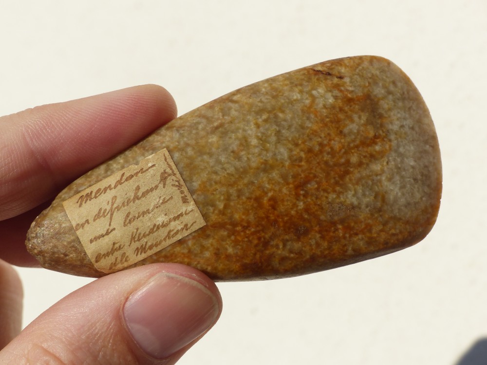 5. Une belle hache taillée en silex. Ce n'est pas un outil mais plutôt une ébauche qui attendait son polissage (opération qui pouvait être réalisée sur un autre site). Elle a été possiblement abandonnée à cause d'une cassure au tranchant. Quant à la datation, on est entre les premières minières (-4300 ans) et la fin du Néo (-2500 ans).