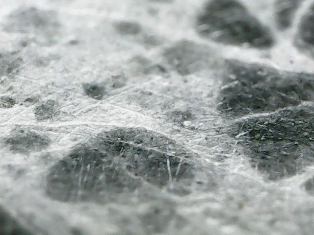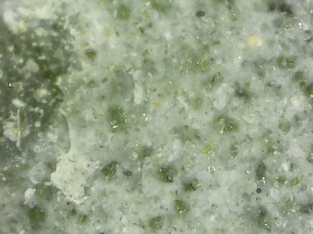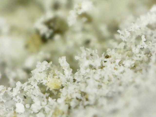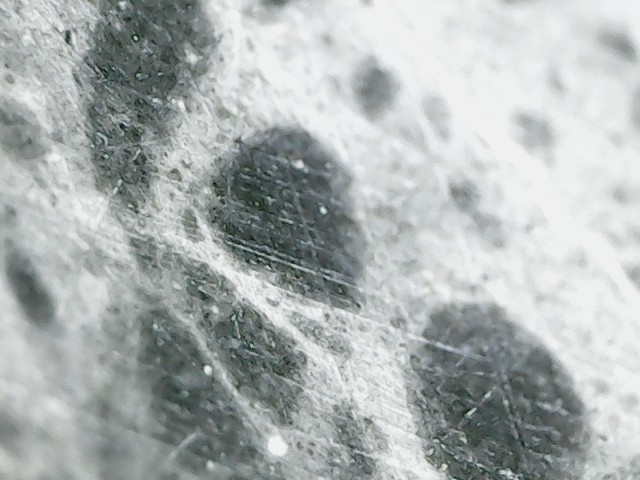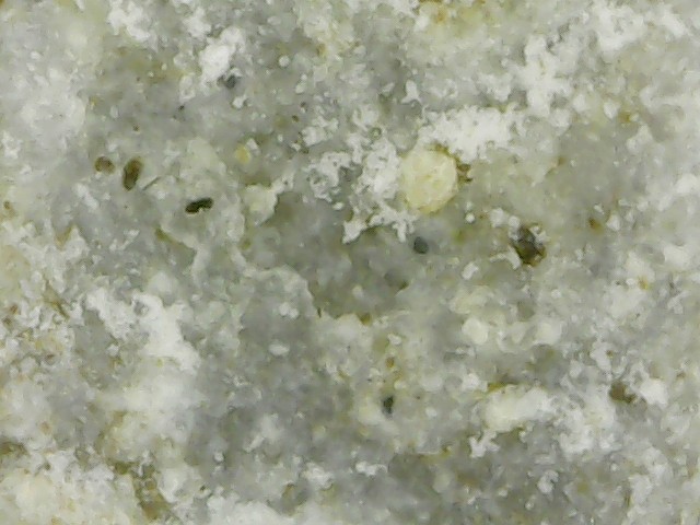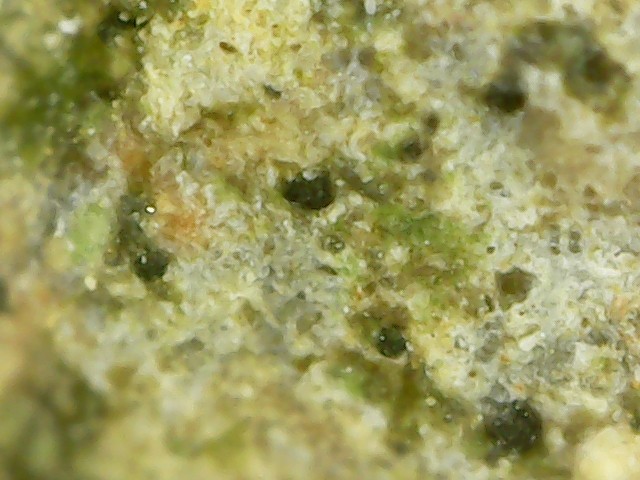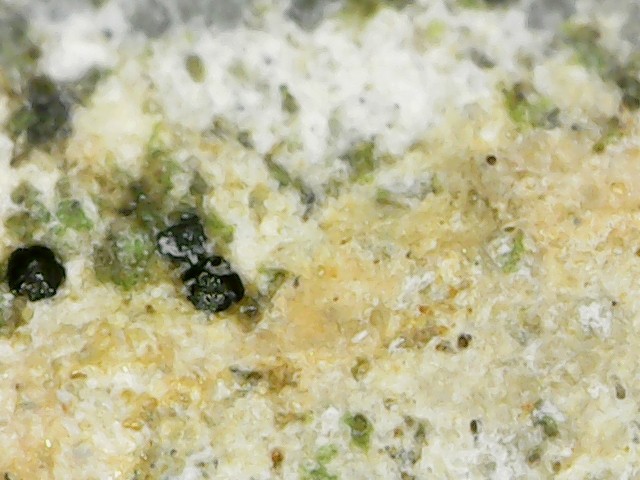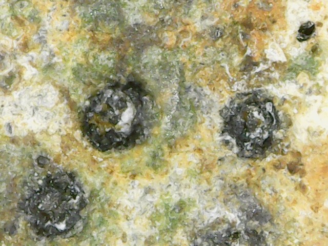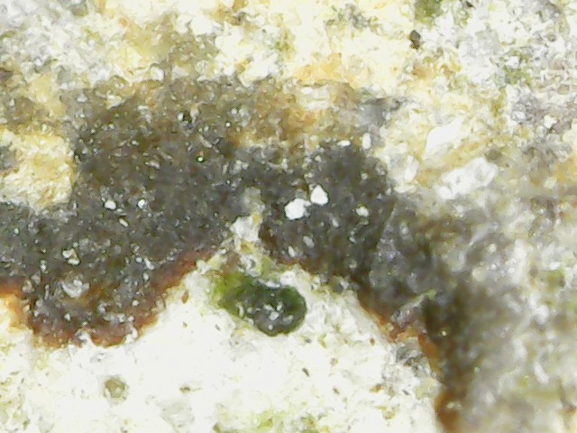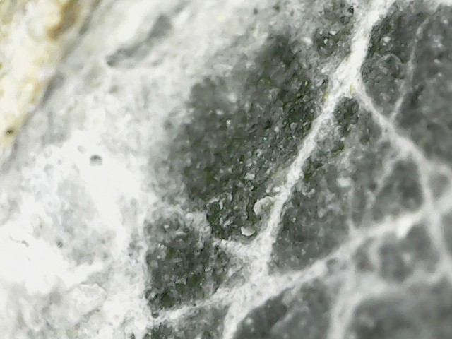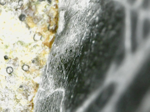 D'abord merci d'être patient avec moi car les échantillons que j'ai mis dans le vinaigre ont réagi. Cela a effectivement mis du temps car l'altération a continué hors du bol. C'est devenu plus pâle, genre gris bleuté, plus léger et à la loupe on dirait une pierre ponce alors qu'avant c'était lisse. Lorsque je frotte l'échantillon au sopalin, une brume se dégage (bon c'est imagé, disons que de la poussière se dégage). Les grains noirs n'ont pas bougé c'est ce qui était "blanc" qui a été altéré. J'essaierai demain de prendre une photo mais ce soir les prises au smartphone ne me semblent pas très nettes, je vais les poster quand même, j'essaierai de faire mieux demain. La prise de vue est l'échantillon mouillé pour mieux voir la réaction. Cet échantillon fait 1cm sur 2cm -