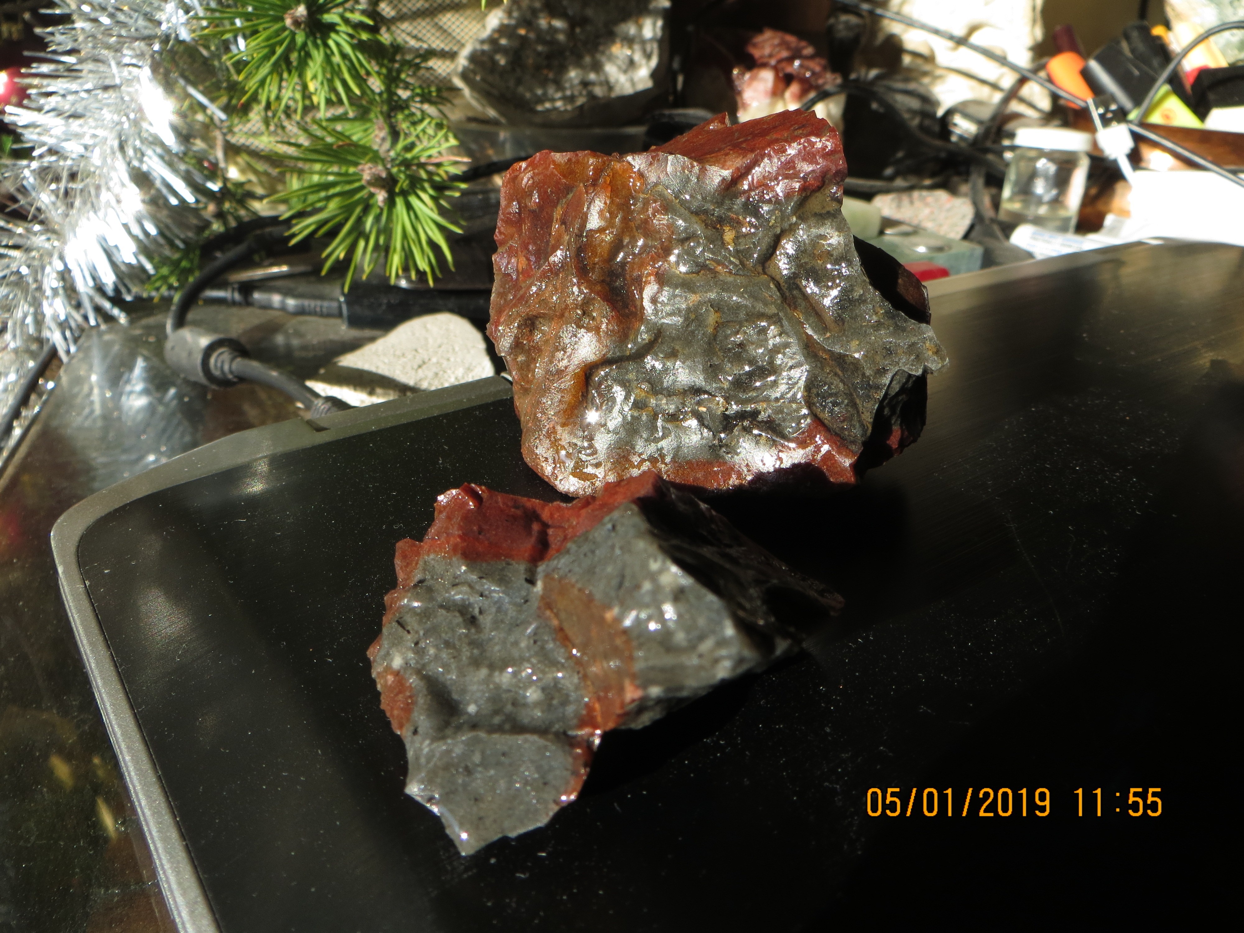 Bonjour à tous et meilleurs voeux 2019! J'ai extrait cette roche rouge et grise d'un bloc de basalte dans les environs de Rochecolombe, en Ardèche. Son aspect est cireux/vitreux. Elle raye le verre. Sa cassure est quelque peu conchoïdale, le clivage est incertain. La roche ressemble un peu à de l'obsidienne acajou et grise. Serait-ce du quartz? On y voit quelques traces noires qui pourraient bien être du pyroxène? Quelqu'un aurait-il l'amabilité de me donner quelques infos à ce sujet. Merci R. Girard -