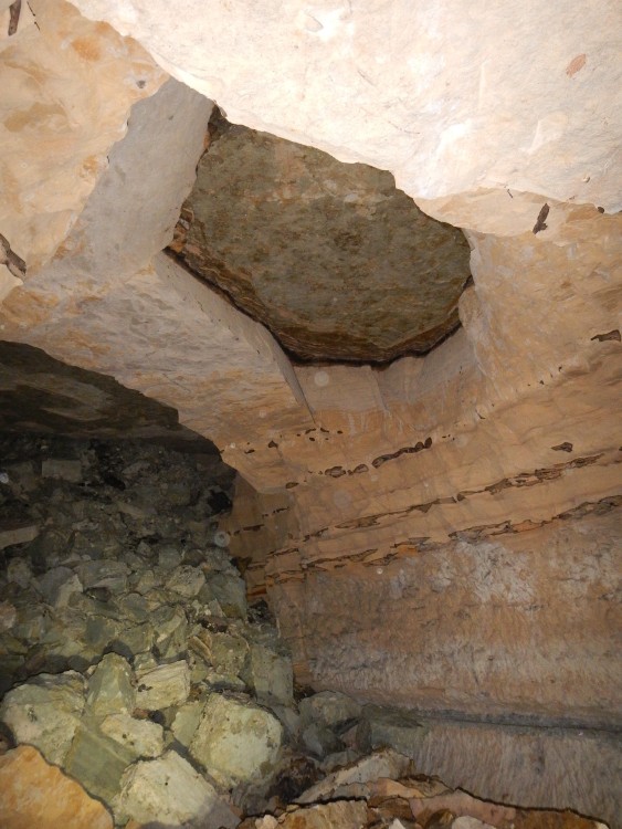 bonjour, je confirme, ce sont les niveaux dits à Chailles qui sont notés sur les cartes géol locales comme marquant la limite entre le Lutétien moyen et le Lutétien supérieur. Du moins c'était comme cela que cartographiquement Michel Laurain avait mis la limite lors de la réalisation des cartes de Craonne et de Fismes. Stratigraphiquement, on trouve ces silicifications ponctuelles juste au dessus du toit des carrières souterraines de pierres rousses (type Courville - voir figure). Mais géographiquement ce sera vrai pour tout le secteur entre Reims et Fismes (dont la vallée de l'ardre) et le Massif de St Thierry, et notamment à Hermonville. Il peut y avoir 1, 2, 3 niveaux de chailles superposés et même parfois plus encore... Parfois la silicification est juste au sein de la matrice fine et elle met en valeur les petits litages obliques qui sont dans les niveaux juste sous les calcaires à plantes. Mais parfois, comme justement dans certaines carrières souterraines d'Hermonville, la silice s'est infiltrée dans la lumachelle dans le calcaire tendre qui est au dessus des bancs de pierre de taille. Et cela donne des silicifications bien plus marquées, proches des silex ludiens. Bref, c'est bien ce qui est indiqué sur le log qui a été donné en exemple, juste au dessus (j'en suis l'auteur). Ci joint une photos au niveau d'une cloche de fontis dans une carrière souterraine du coin. On voit bien les différents niveaux de silicifications. -